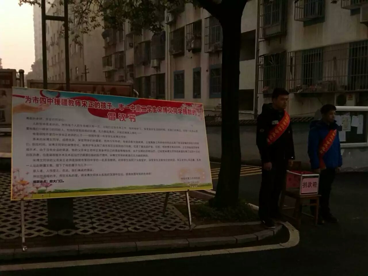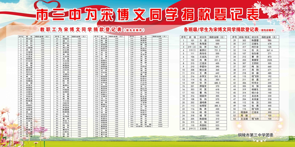 自2015年12月20日得知宋博文同学的遭遇后,市三中高度重视,迅速行动,校团委和校学生会及时利用校园网、校园广播发布捐款倡议书并群发短信告知全体教职工。同时,还在校大门口醒目位置放置倡议书展板和募捐箱,号召全校师生伸出温暖之手,奉献爱心,拯救年轻生命。随后,钟校长带头捐款,全体师生尽己所能,纷纷献出自己的一份爱意,涓涓爱的细流短时间汇成爱的海洋。。。