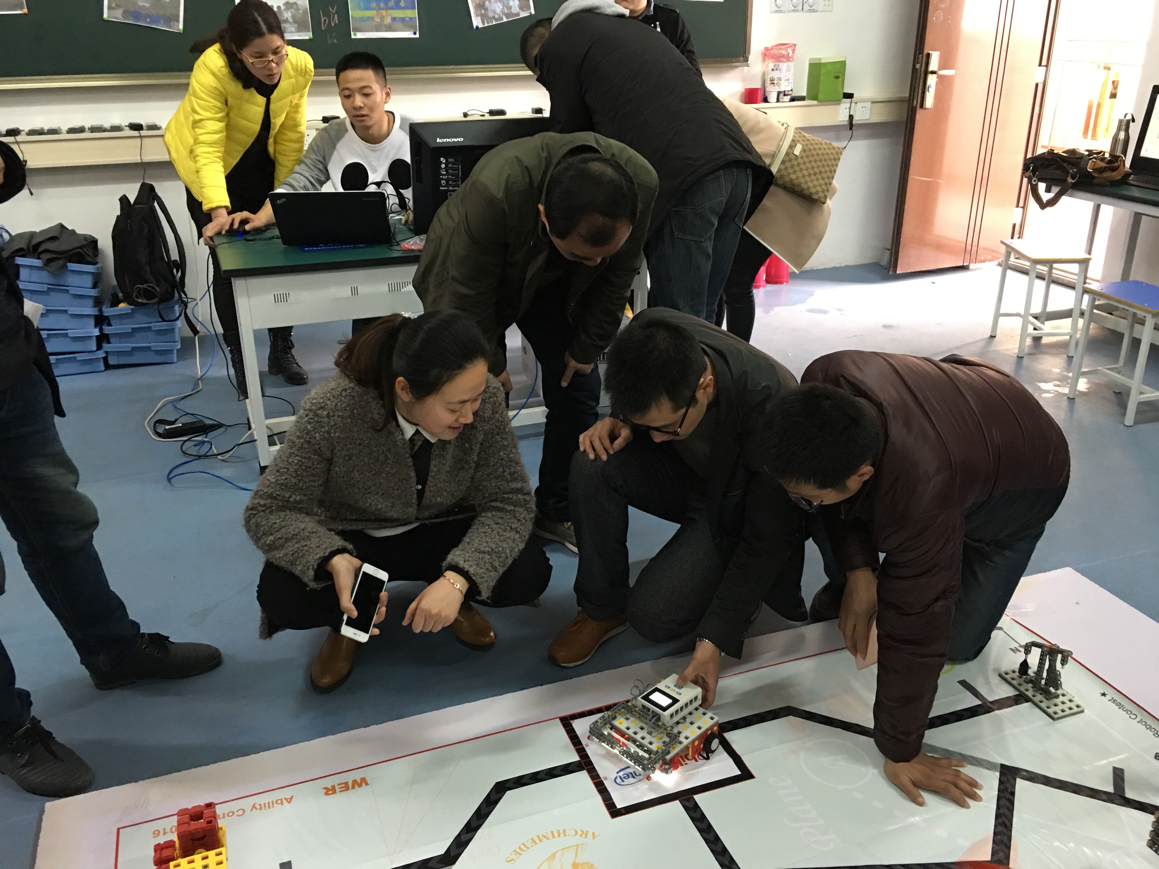 课后,核心组成员就课题阐述各自己的观点,提出了修改的意见和建议。说课活动结束后,机器人教练员还进行机器人教学现场研讨。
