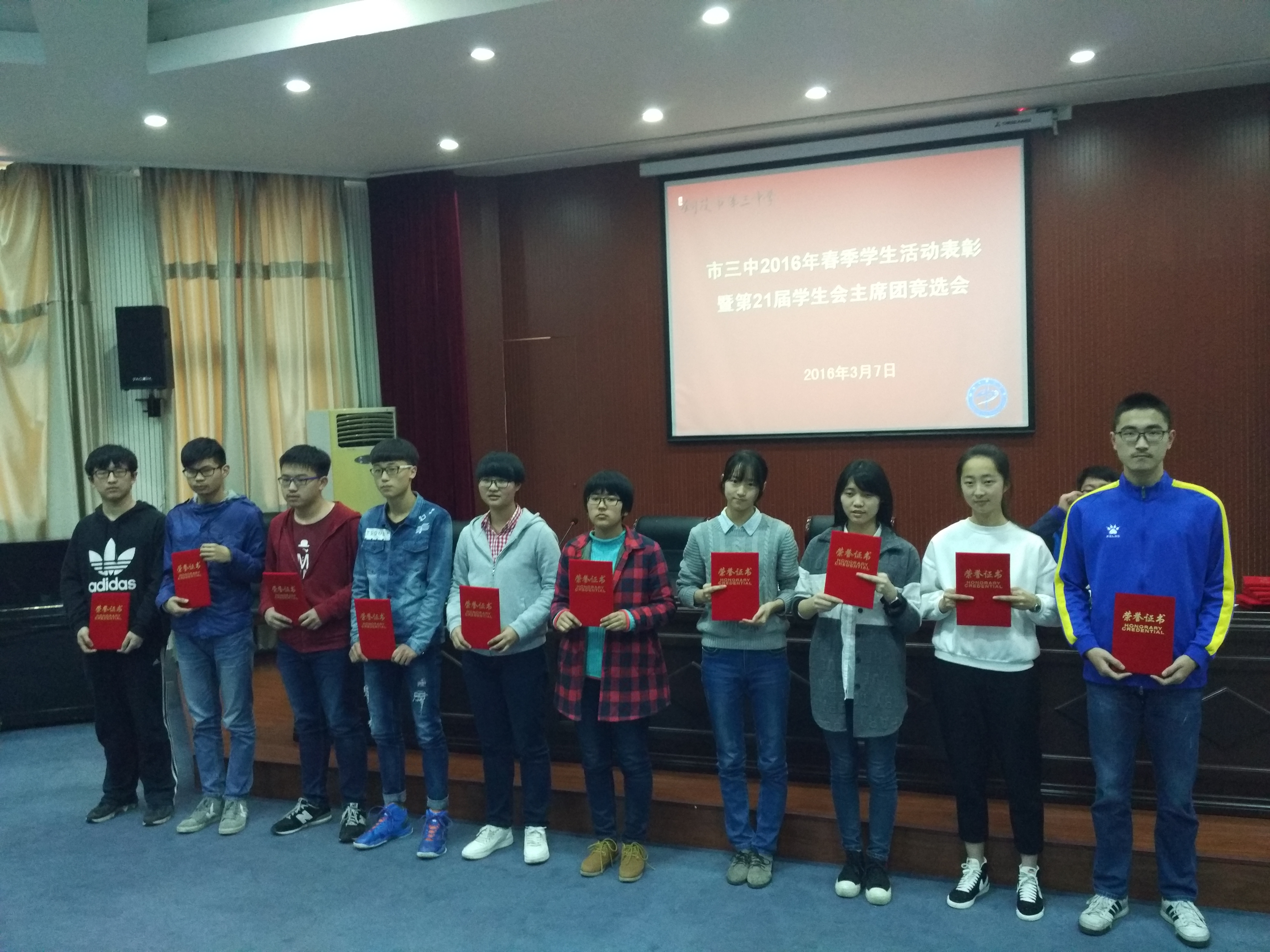 2015年度,校学生会和各社团以纪念建校50周年活动为契机,组织开展了一系列丰富多彩的校园文化活动,涌现出一批优秀的学生会干部和学生社团,在前期会议评选基础上,综合平时活动表现,任诗豪、江楠、章云舒等同学荣获2015年度“优秀学生会干部”荣誉称号,漫三漫研社、舞蹈社、绿影社等社团荣获“优秀学生社团”荣誉称号,校报《我们》荣获“优秀组织奖”。