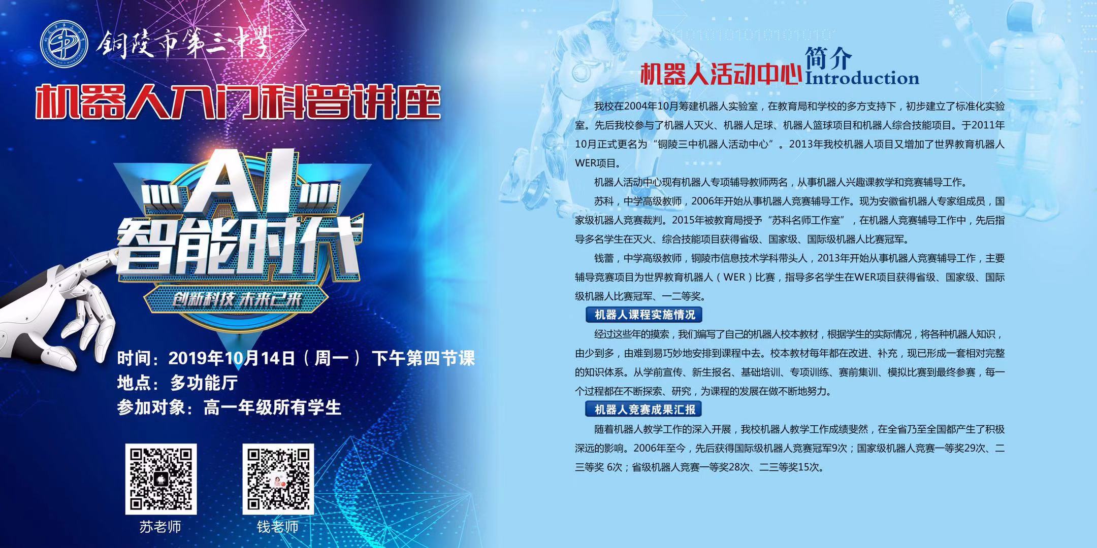 2019年,我们不忘初心,继续前行。10月14日,机器人活动中心面向高一新生开展机器人入门科普讲座《AI智能时代》。钱蕾老师从机器人的历史、分类、发展等多个维度给同学们带来一场精彩的科普盛宴。来自全校近100名学生认真聆听讲座并参与了互动环节。