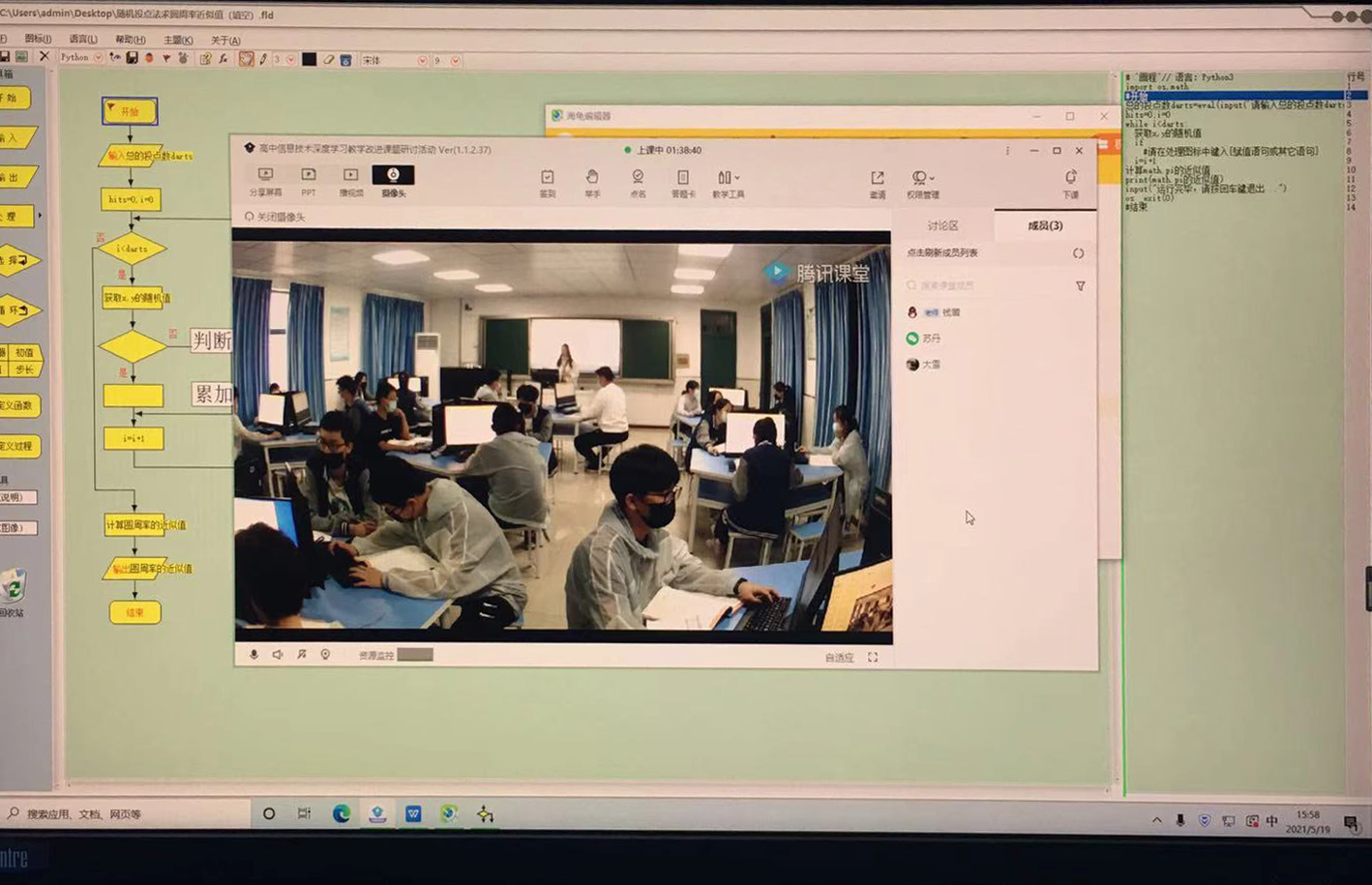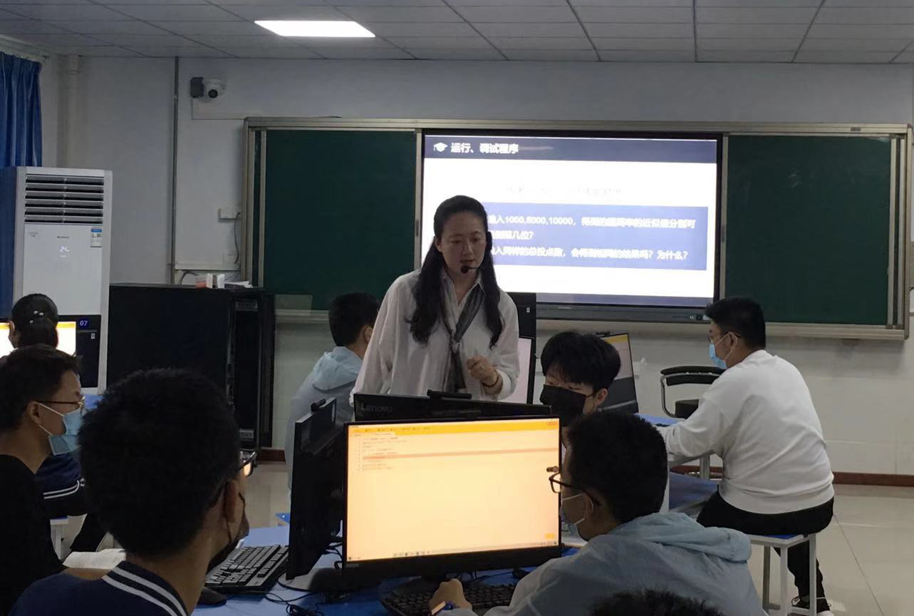 钱蕾老师通过几何画板,形象生动地向学生展示了随机投点法计算圆周率的算法原理,通过学习任务单精心设计的问题引导学生探究利用计算机实现随机试验求解问题的过程和方法,构建循环和选择结构的控制流程,鼓励学生使用数字化工具描述问题的算法,并使用计算机程序语言表达算法,通过多组试验参数的调试运行,验证算法的结果,将培养学生的计算思维这一核心素养渗透在教学的各个环节,启发学生学会用计算机解决问题的思维和方法去解决身边的问题。