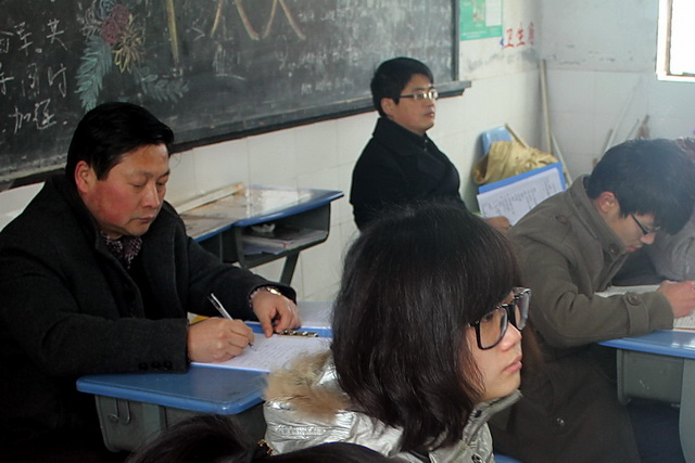 本校讯 2013年1月11日上午第二节课,校党总支书记、校长钟士标带领教务处主任张尤俊进行了推门听课活动。在随机步入的1号教学楼高一(6)班教室,钟校长认真倾听了语文教师古婷执教的《赤壁赋》一课。在45分钟的时间内,钟校长一直专注听课、认真记录。课后,钟校长还重点查看了上课教师的教案撰写情况。