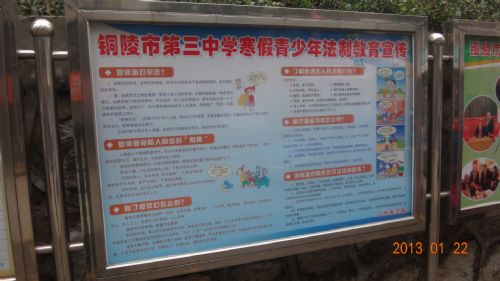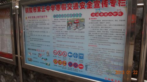 寒假将至,为使学生过一个安全、祥和的假期,按照学校领导的指示和工作安排,校保卫科和政教处等职能部门,开展了一系列的活动,召开全校法纪安全教育广播大会、召开班主任工作会议、寒假致学生家长一封信等,反复强调安全第一、守法第一。近日,校保卫科又在学校的宣传橱窗新添了两块有关寒假法纪安全教育的展板。