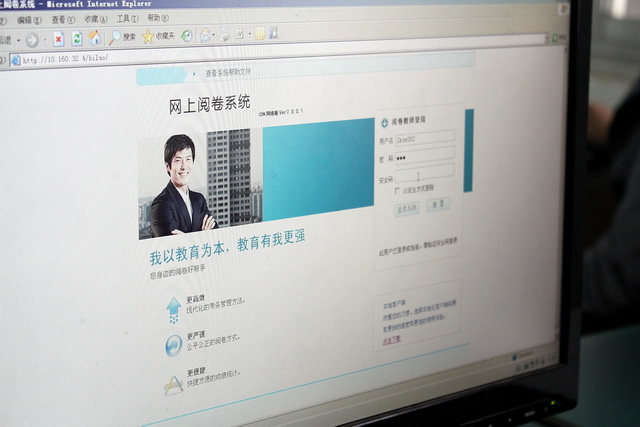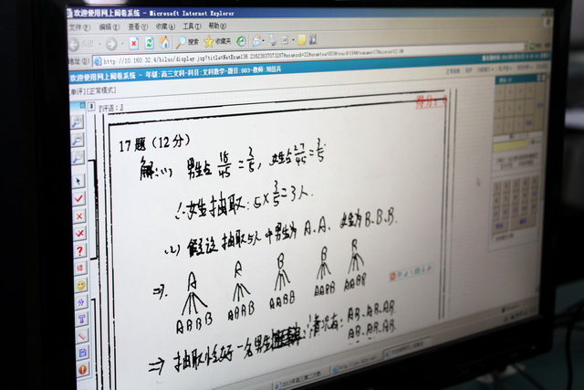 3月30日下午起,高三年级各科教师在科学馆四楼机房轮流网上阅卷。大部分高三教师首次体验网上阅卷,及时发现了学生答题中存在的如签字笔不合要求、不在规定区域内答题、字迹不清等问题。