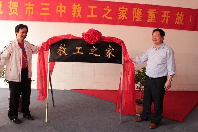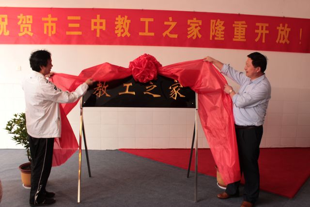 在热烈的掌声中,钟士标校长和郑国主席共同为“教工之家”揭牌,开启 “教工之家”的大门。