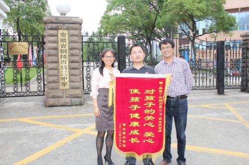 本校讯 2013年高考刚刚结束,在我校就发生了动人的一幕:铜陵三中2013届高三(10)班学生朱轶宸的父母赶到学校,将精心制作的写有“对孩子的关心爱心,使孩子健康成长”的锦旗送给班主任丁学智老师。