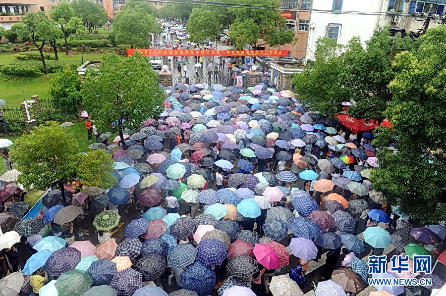 当日,2013年高考拉开帷幕。全国多地迎来降雨天气,众多考生雨中赴考。 新华社发(过仕宁 摄)