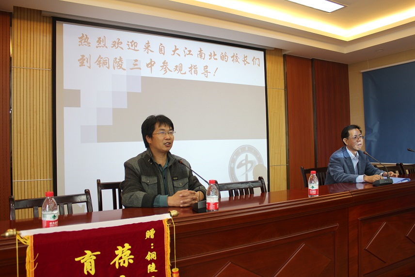 吴书记和叶校长给来访的校长们介绍了我校的办学思想、办学愿景和特色。校长们对于我校现代化的基础设施和古典园林文化尤为赞赏,认为铜陵三中布局大气雅致,学校生态绿化别具特色,道路线条流畅鲜活,是绿色教育的典范,良好的人文环境让学生的精神和气质得以栖息,铜陵三中真正成为学生们的青春动力加油站。