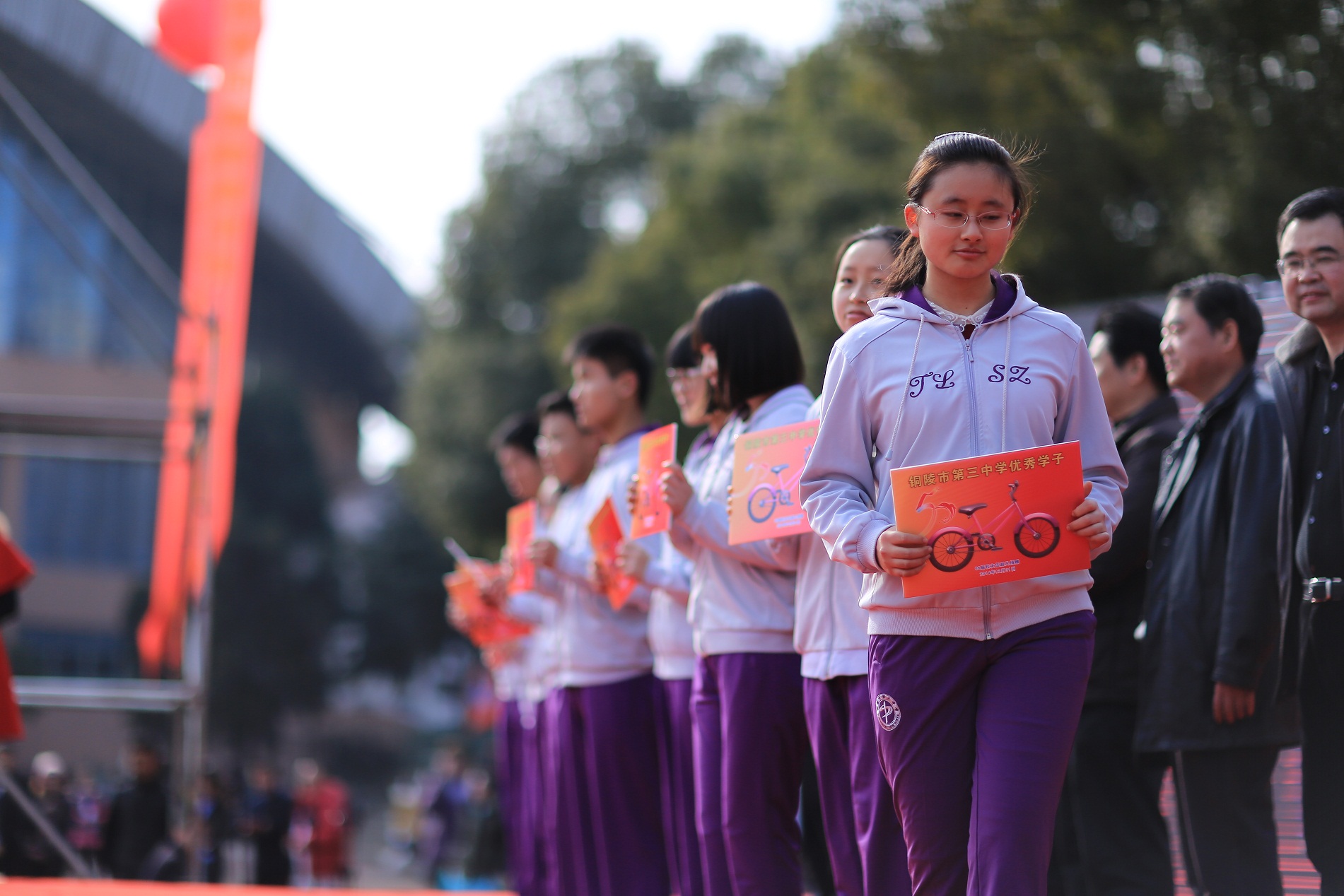 为了激励学弟学妹们健康成长,资助更多贫困学子完成学业,伍超凡先生将定期向母校学子捐助不同数额的奖学金。现场嘉宾和领导为三中优秀学生授奖,奖品是08届校友90后的伍超凡先生捐赠的18辆高档自行车。他希望自己的捐助能带动更多的校友加入到捐资助学的行列,为母校的发展做出贡献。