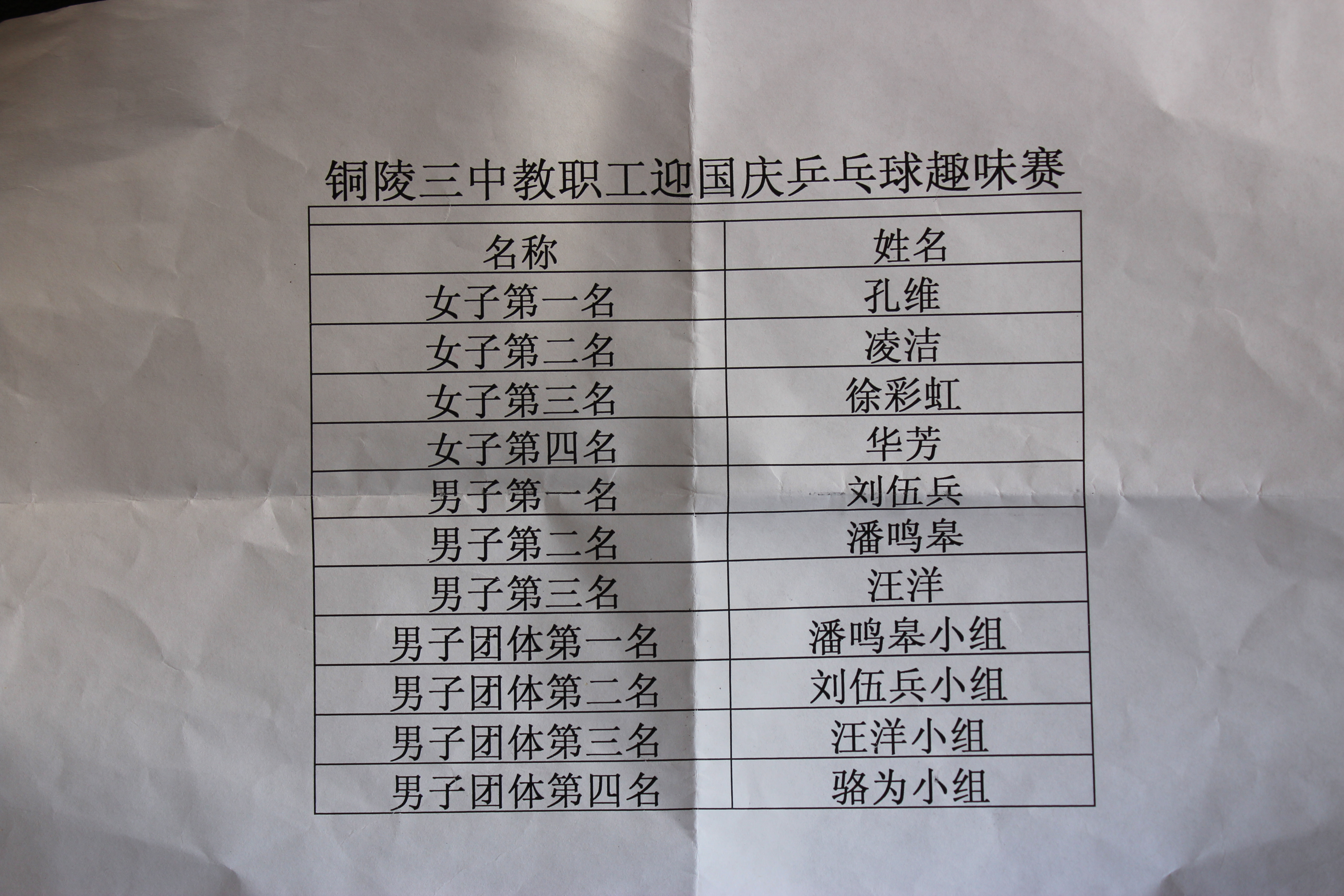 十月三中,秋高气爽,学校为了丰富教工的业余文化生活,倡导身体健康,心理阳光,学业进步的办学理念,校工会组织举办了这次教工乒乓球比赛,为了鼓励更多的乒乓爱好者参与其中,特地以分组对抗为主,个人对抗为辅的比赛模式,分别由刘伍兵,潘明皋,汪洋,骆为四位老师各带领四个小组进行循环比赛,共有二十名教工报名参加,报名人数创历年之最。比赛进行了三个下午,选手们热情高涨,挥汗如雨,各队为球员的精彩表现呐喊助威,队员们敢打敢拼,队友们帮忙支招,大家都一致认为这样的比赛提高了球技,增进了交流,相信以后会有更多的教职工参与和支持。