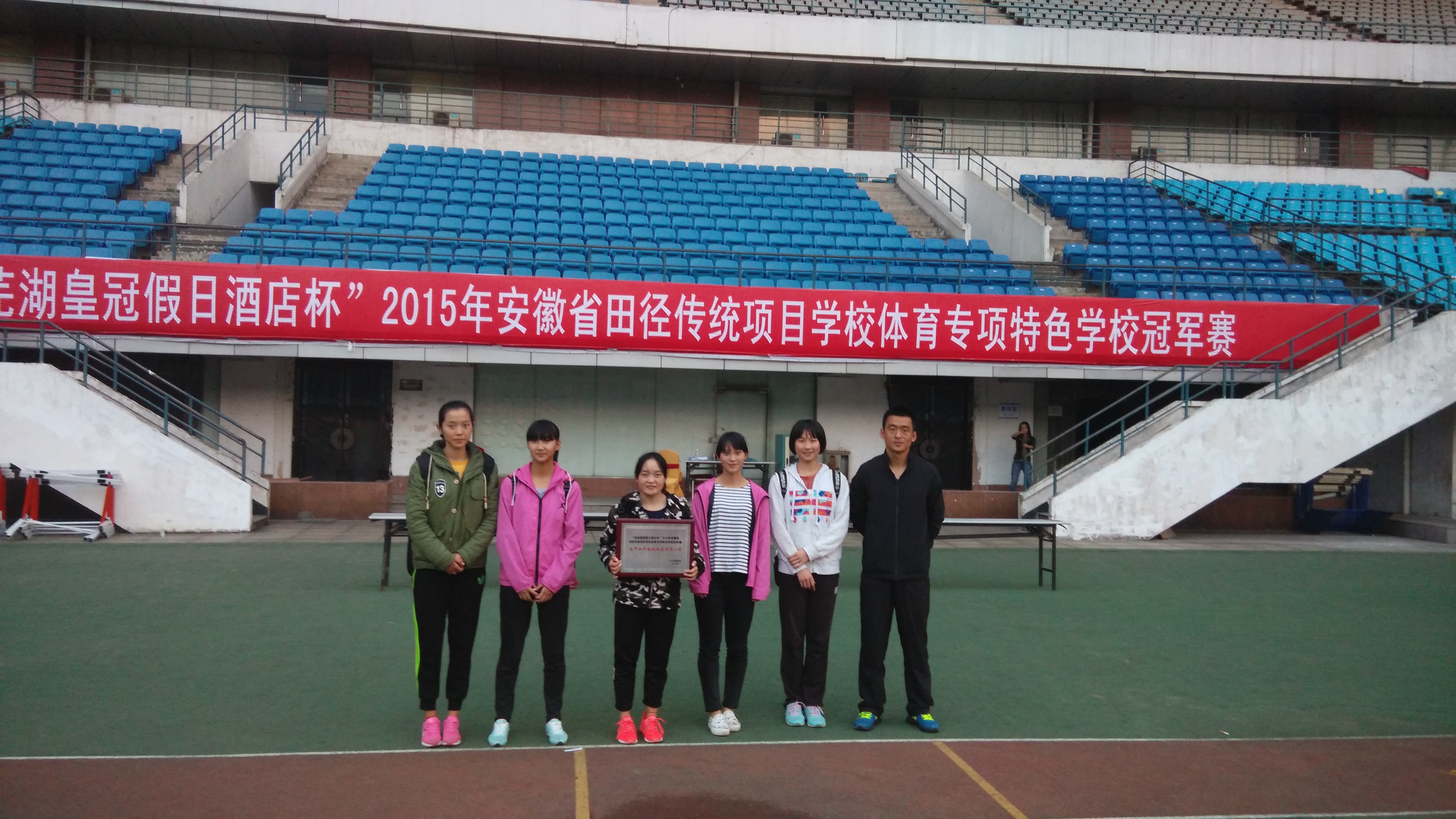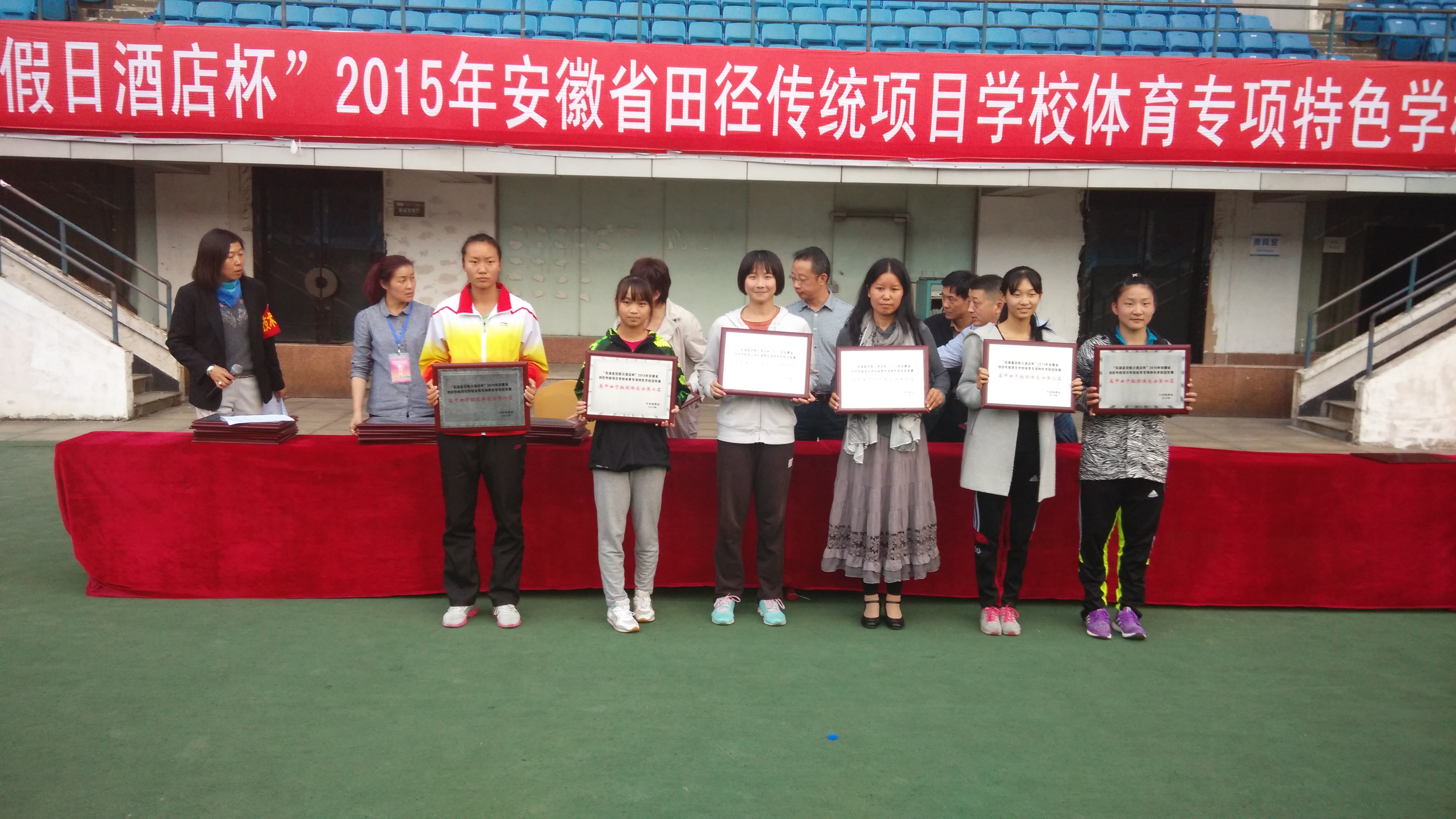 我校代表队于2015年11月1日至2015年11月6日,参加了芜湖举办的“芜湖皇冠假日酒店杯”2015年安徽省田径传统项目学校专项特色学校冠军赛。比赛中我校运动健儿克服赛程密集、比赛强度大等重重困难(其中李超群和徐丽萍两名同学一天比四枪),获得女子团体总分第二名的好成绩。李超群(高二7班)、徐丽萍(高二7班)、倪少芬(高二8班)、刘洋(高三5班)四名同学同时获得4X400米冠军和4X100米亚军的好成绩;李超群同学还获得了高中组女子400米栏亚军等其他个人奖项。