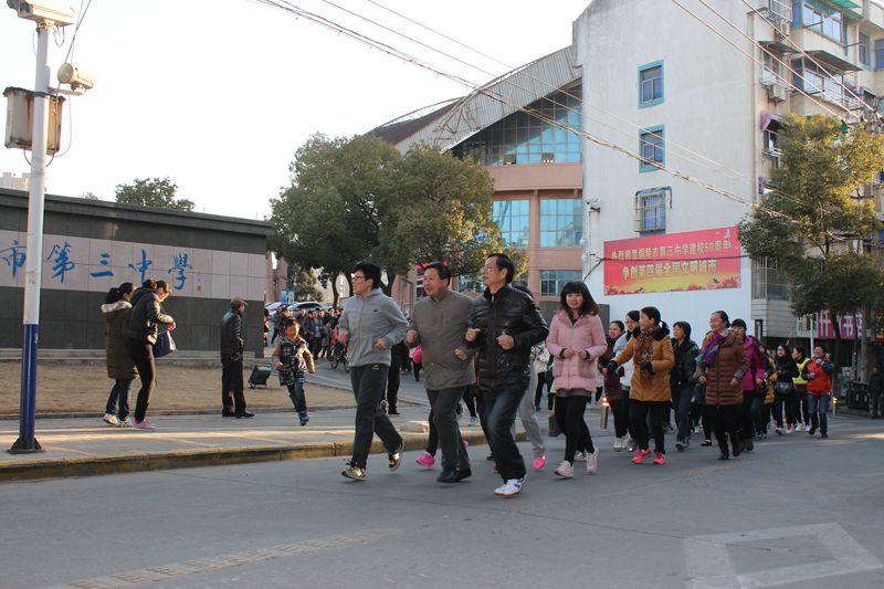 本次长跑从三中出发,至市政府广场折返,全长约3000米左右。校领导钟士标、吴翀、叶叶等热情参与。