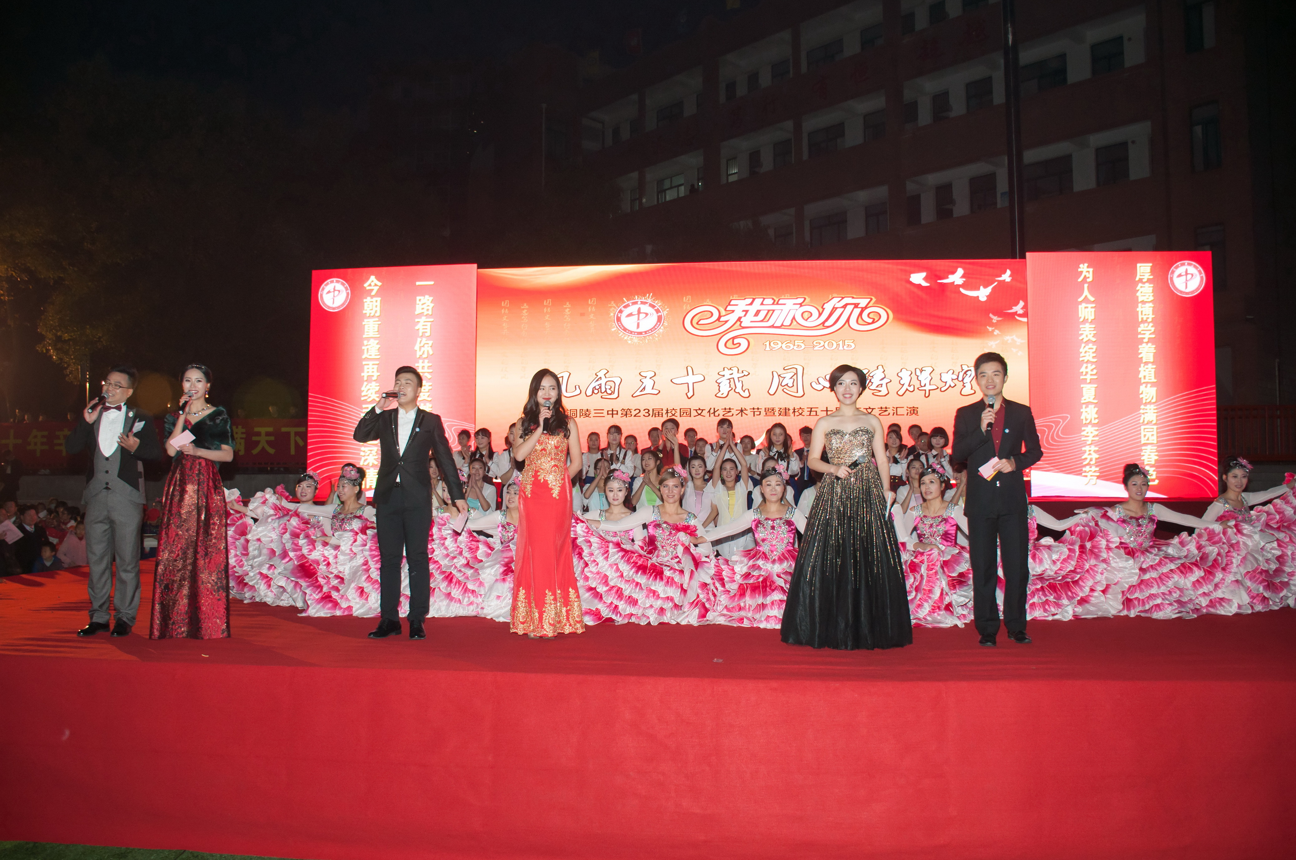 校党总支副书记吴翀,校优秀语文老师古婷,15届优秀毕业生、苏州大学凤凰传媒学院在读学生姚凯迪、李超,配乐朗诵现任副校长叶叶和余徐刚老师创作的献给母校的颂歌——《母校,生日快乐!》。50年来,三中精神薪火相传,正虎虎生气,阔步向前。学生流行音乐社团的民谣组合精彩演绎《南山南》,舞蹈社团表演现代舞《律动青春》,朗诵社团带来经典诵读《少年中国说》,舞蹈队表演舞蹈《毕业照》,形式多样,丰富多彩,歌舞青春,充分展现了我校素质教育的丰硕成果。