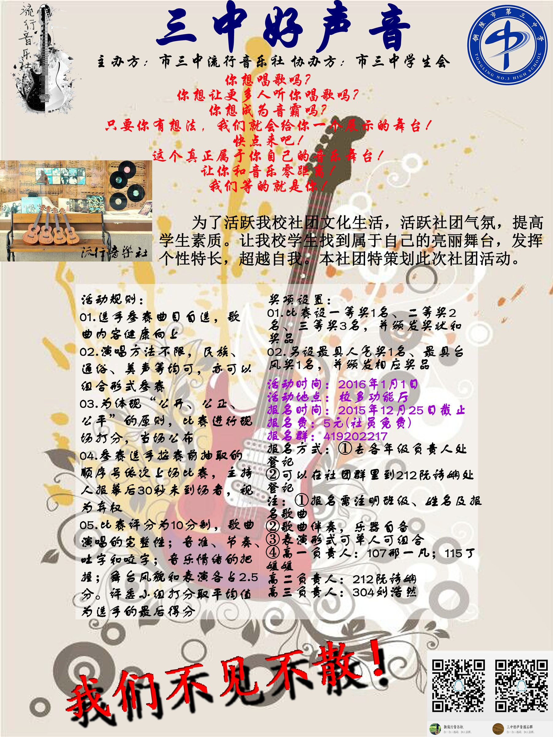 为丰富三中校园文化生活,活跃社团气氛,提高学生综合素质,在校政教处和校团委的指导下,校流行音乐社和学生会近期将策划举办首期《三中好声音》大赛。