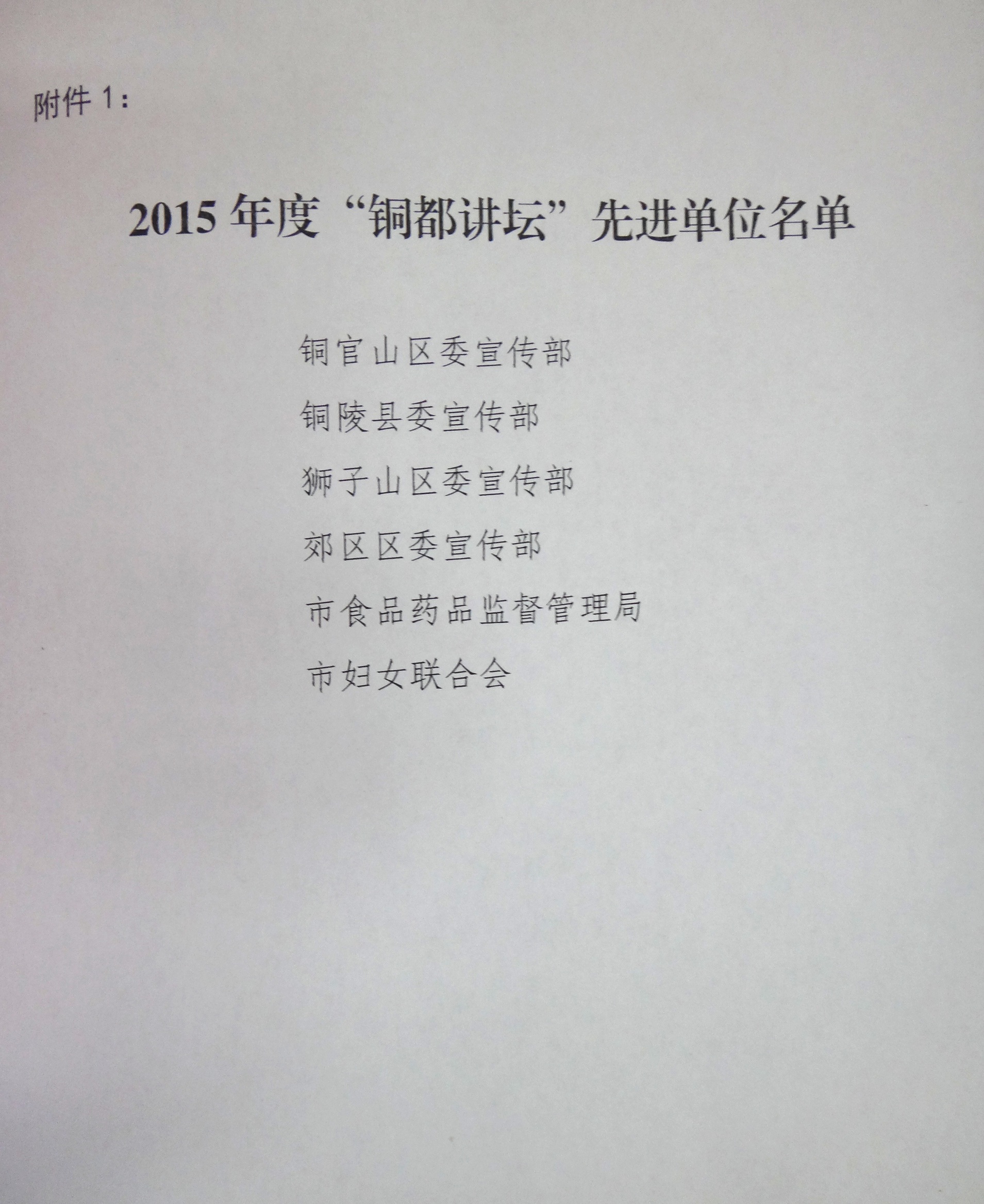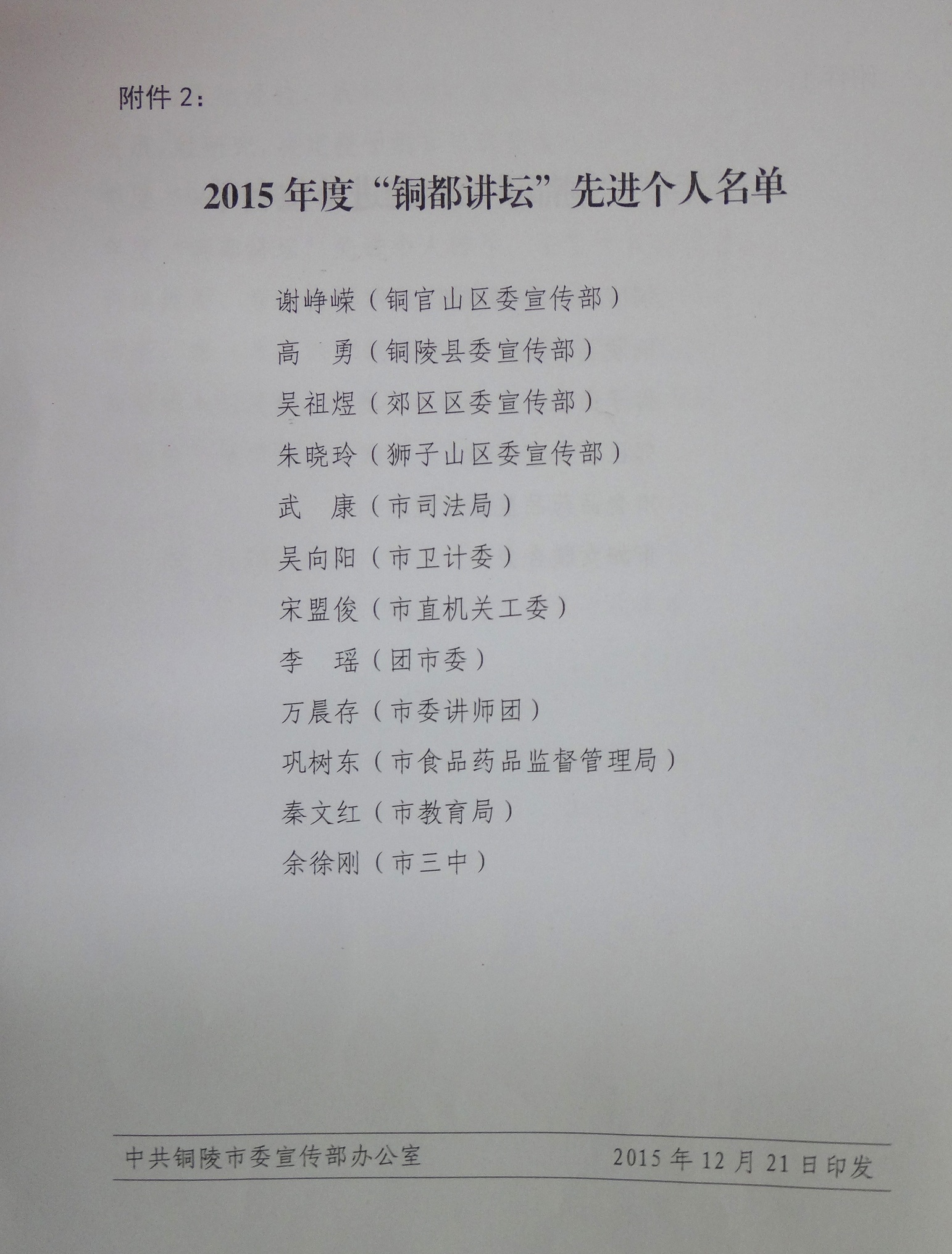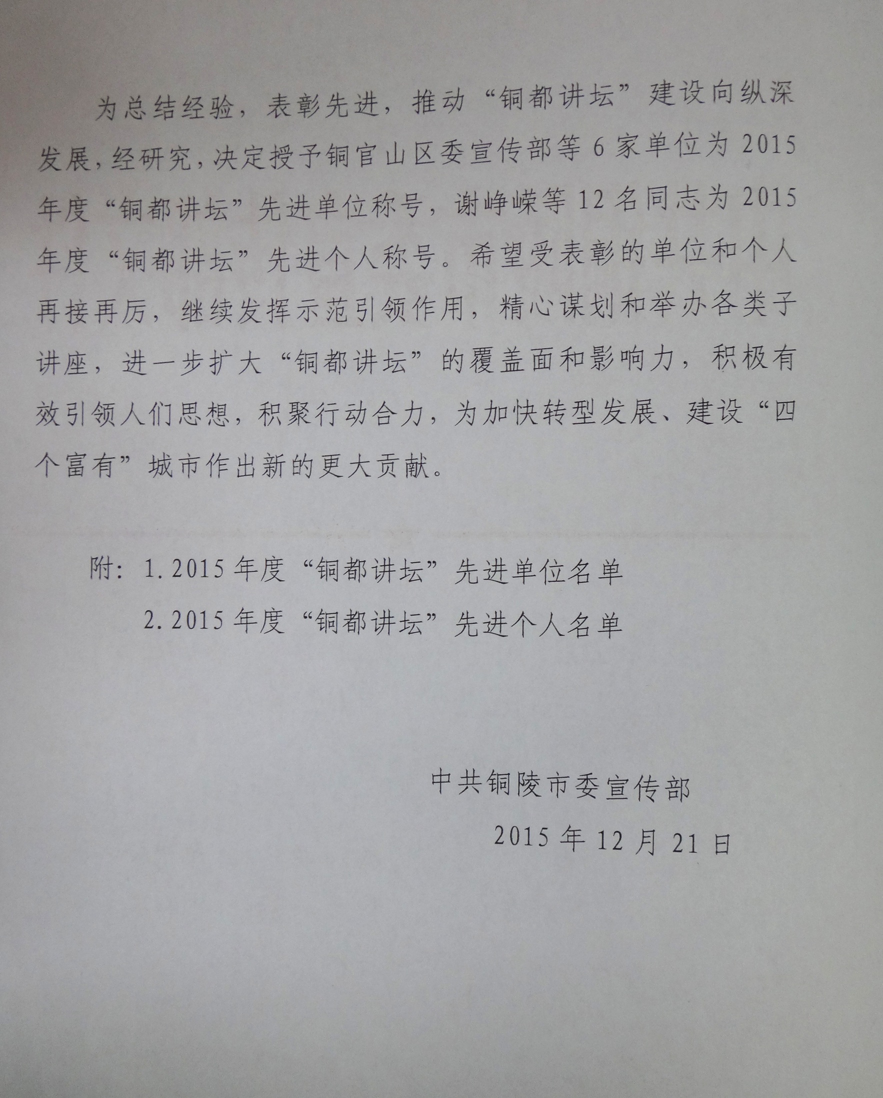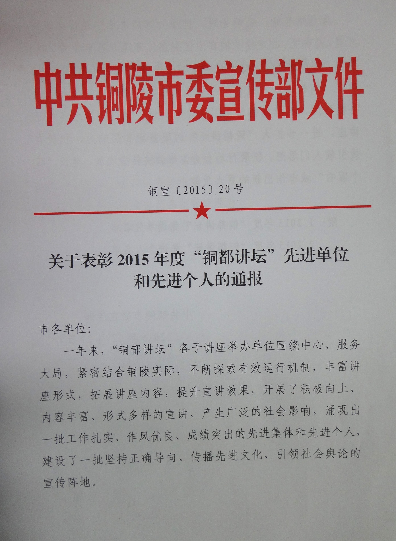 接市委宣传部文件,我校余徐刚老师因工作突出,获2015年度“铜都讲坛”先进个人表彰和现金奖励。此次教育系统有两人获“先进个人”奖励,另一位是教育局的秦文红。