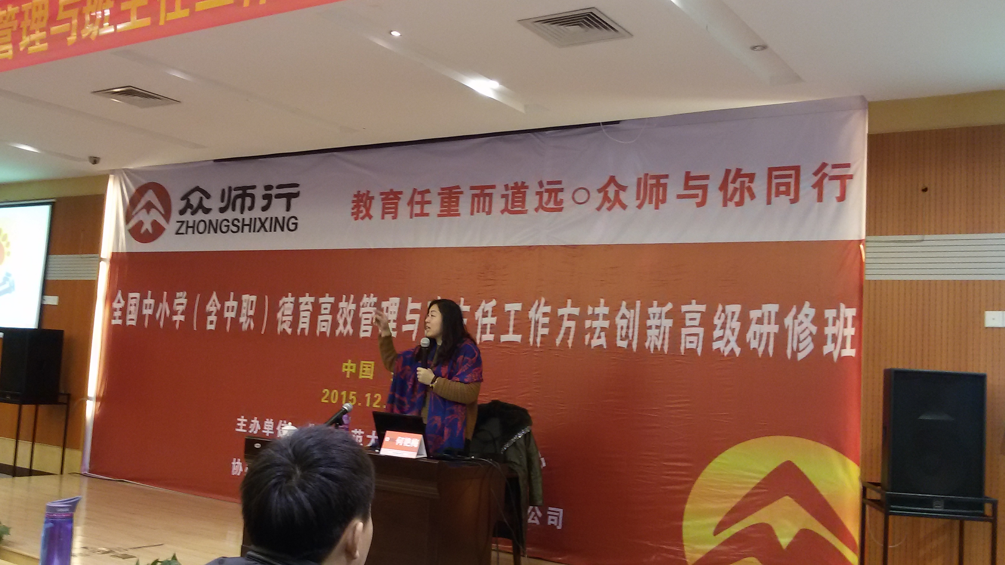 次日上午第二场由北京市优秀教师、优秀班主任何艳梅老师作《坏学生成就好老师》的报告。何老师语言轻柔甜美,姿态自然可亲。她指出,班级管理应突出“众”字,即班级规则“众人制定,众人管理”,并着重介绍了规则维护的方法——“记录式管理”。