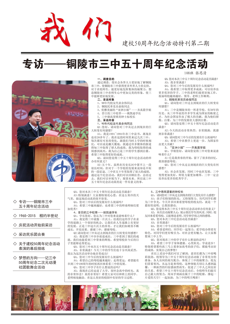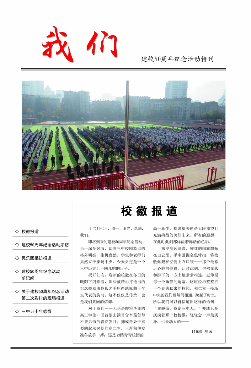 回顾过去一年,思绪万千,累累硕果飘香:2015年,我校高考成绩再创辉煌。紧接着,三中又迎来一批高一新生,为学校注入了新鲜血液。2015年,一场场热火朝天的活动让学校更加红红火火——第50届田径运动会、教职工篮球比赛、学生会和各社团组织丰富多彩的展示活动等等充分展现了全体师生拼搏向上、团结合作的熠熠风采;高三毕业成人礼、五十周年建校纪念活动、校园文化艺术节等活动,充分展现了学子风采,展示了学子才艺,陶冶了学生情操,提升了学生精神文化素养。校刊《我们》再度扬帆远航,学生会活动渐入佳境,志愿活动热火朝天,丰富了校园生活,提升了同学们的综合素质和能力。全体师生在活动中享受乐趣,收获幸福。