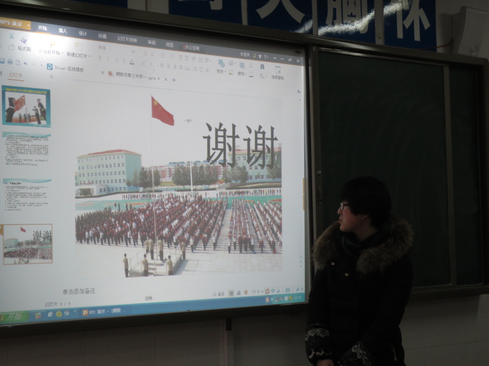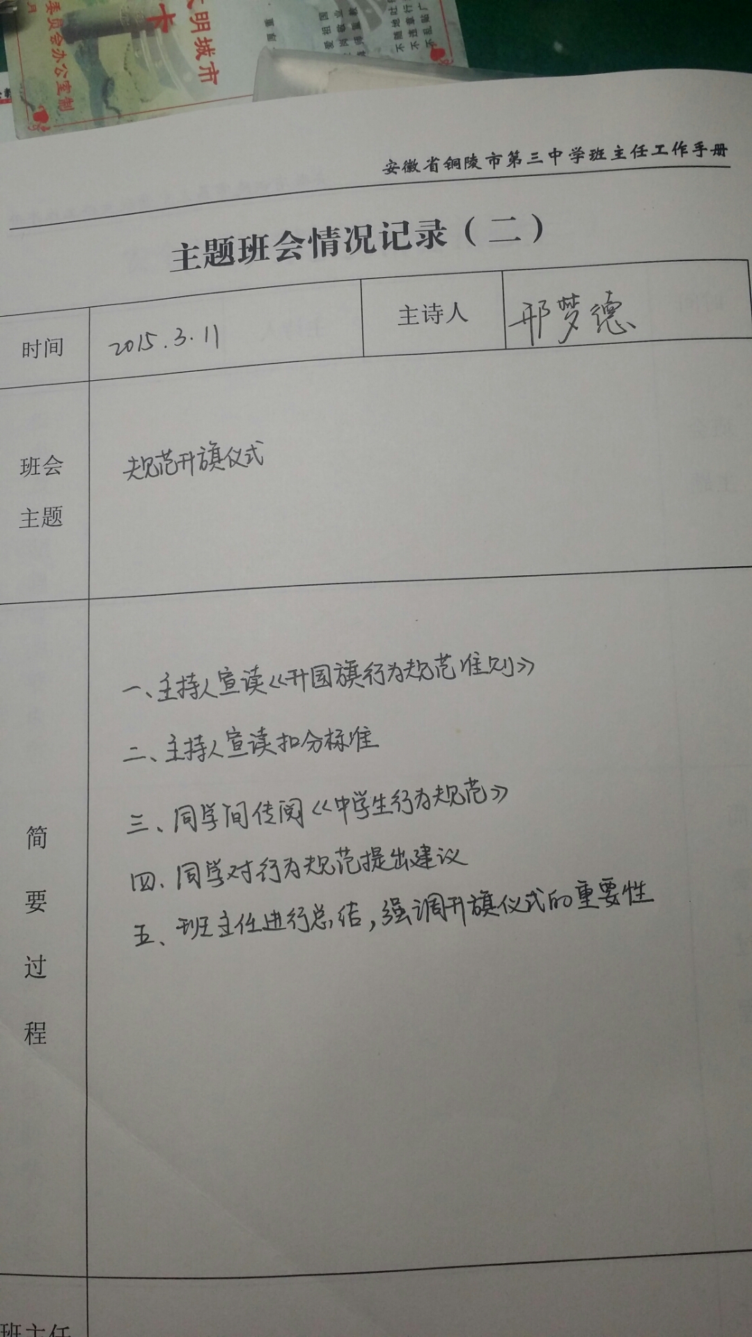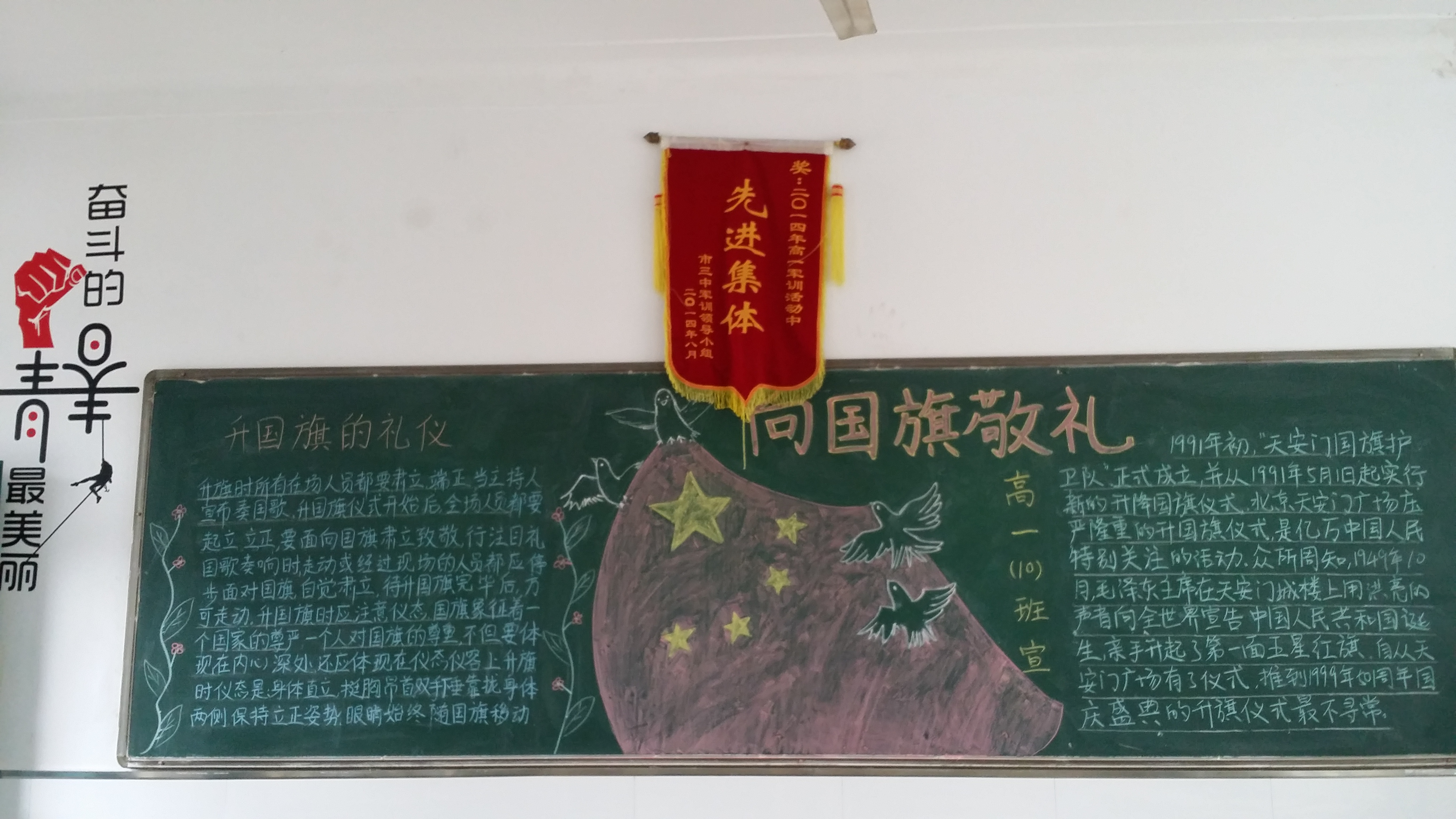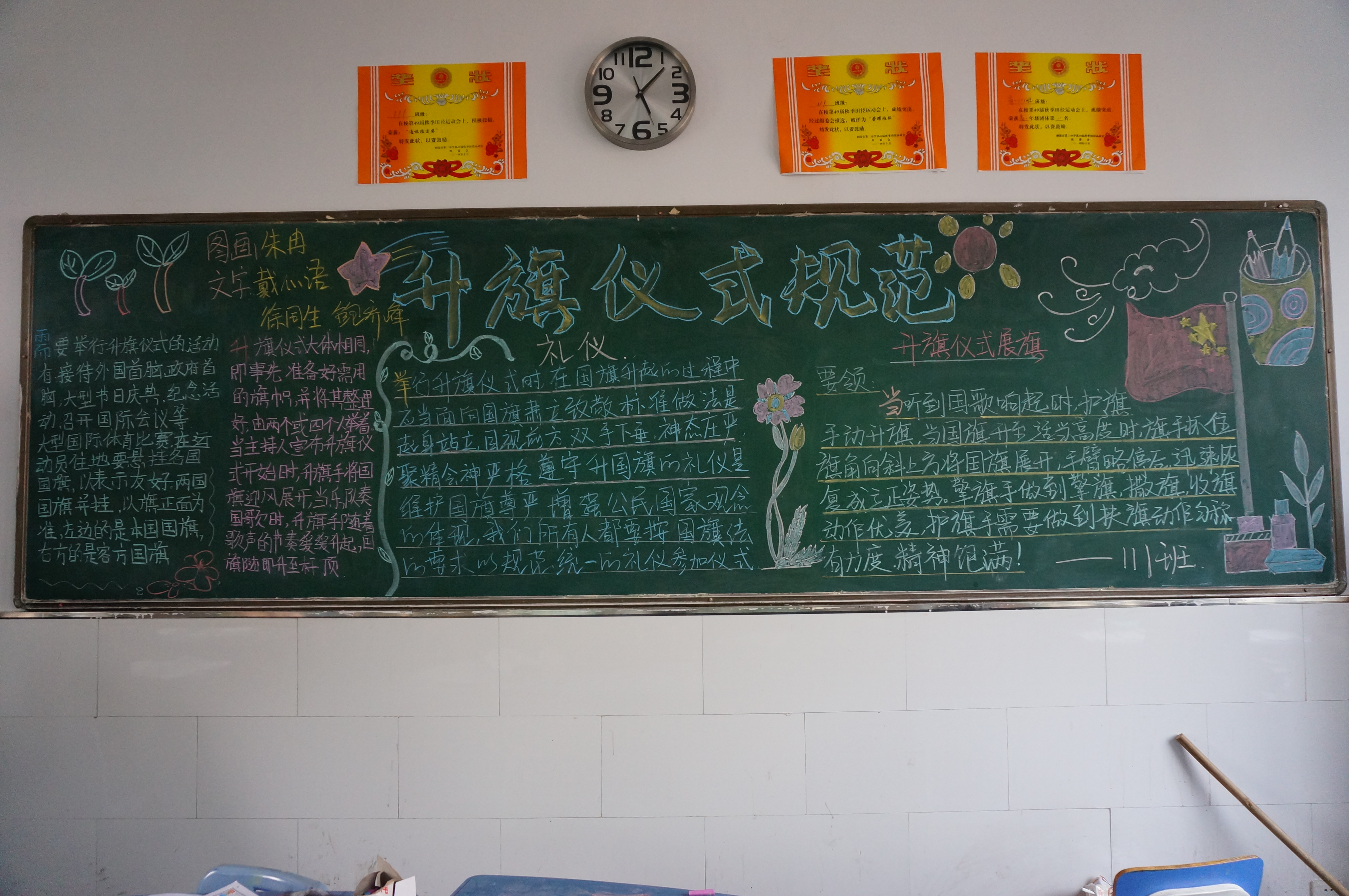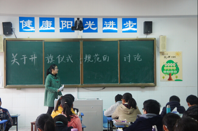 活动布置后,各班级积极组织,精心准备,开展了形式多样的“升旗仪式规范”主题团日活动。例如,112班精心设计黑板报,借助多媒体模拟升旗仪式,结合自身感受,围绕“进场—升旗期间—退场”三个环节存在的问题以及如何规范发表肺腑演讲,最后由班主任进行归纳总结,升华教育效果。118班则按照“指出问题—分析问题—解决问题”的思路,分组展开热烈讨论,选出代表发言,最后班长总结点题,活动以全体同学起立,唱国歌的形式圆满结束。