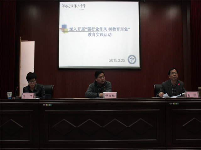 随后,吴翀副书记宣读了《铜陵市第三中学“强行业作风 树教育形象”教育实践活动实施方案》,部署相关工作,要求每位教师严肃态度,认真对待,有问题的要积极整改,在全校范围内广泛开展“强行业作风 树教育形象”大讨论活动,每位教师均要将自己的认识形成文字材料按时上交。