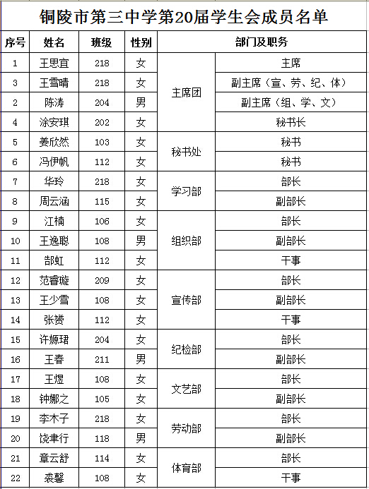 主席团成员确定后,4月1日,参考新一届学生会主席团提名情况,经校政教处、团委研究,最终产生了铜陵市第三中学第二十届学生会。成员名单如下: