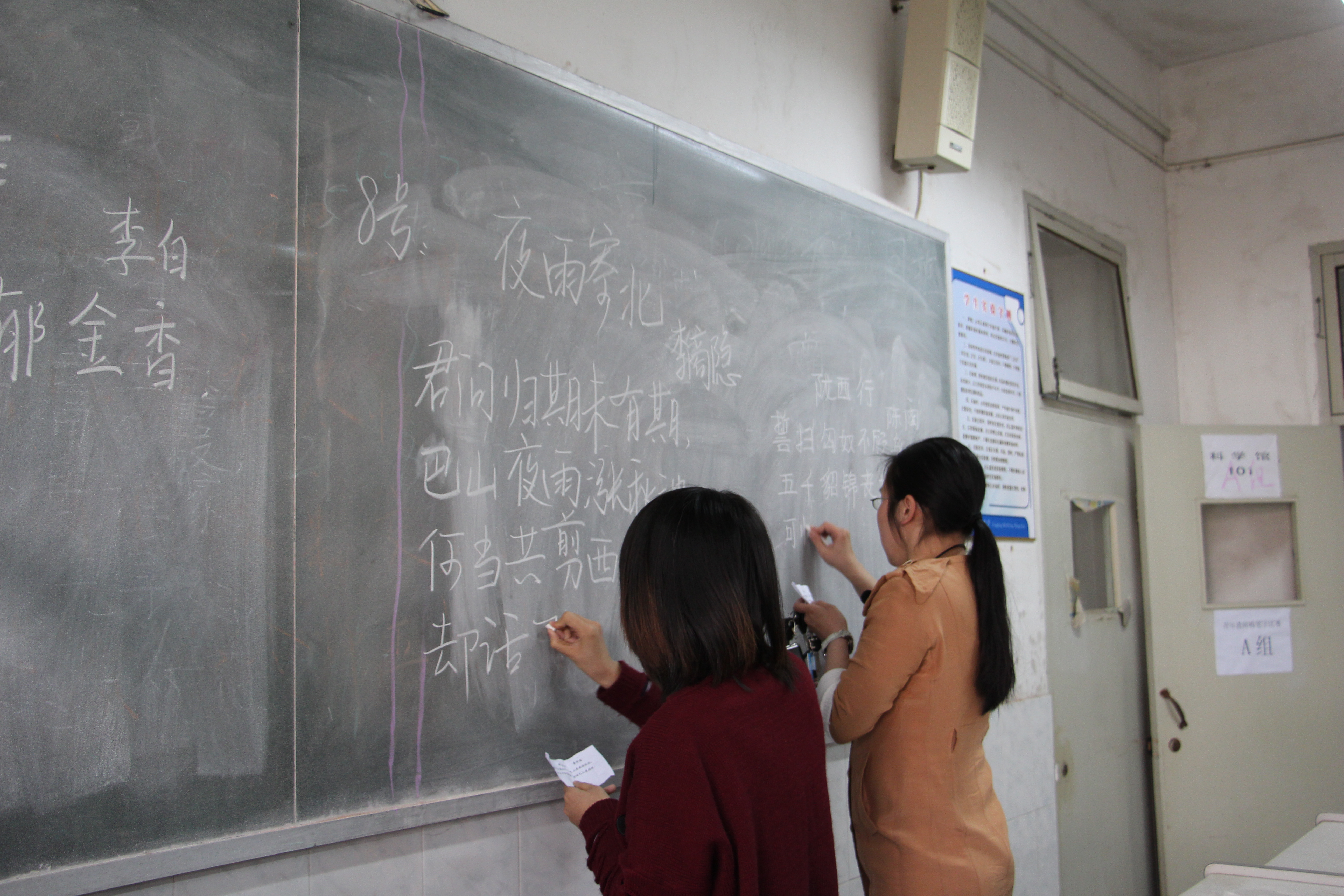 为推动青年教师业务素质的不断提升,强化认真练习粉笔字的意识,进一步提高粉笔字书写水平,强化板书技能,2015年4月22日下午,教科室在校科学馆一楼教室组织了青年教师现场粉笔字比赛,我校35周岁以下的61位青年教师均踊跃参加。