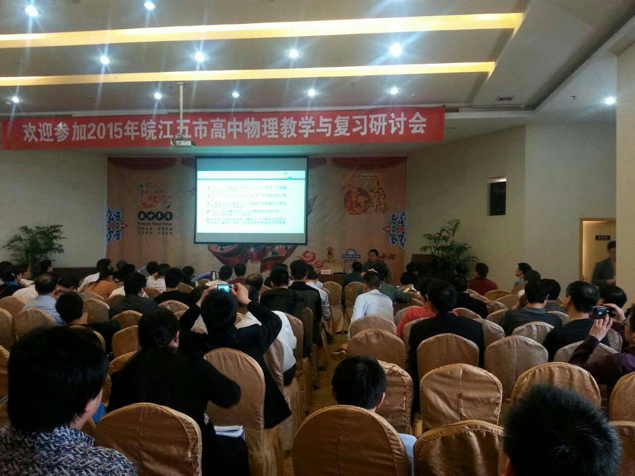 4月1日-3日,2015年“皖江五市”高中物理教学复习研讨会在芜湖举行。来自芜湖市、铜陵市、亳州市、滁州市和宣城市共两百多名高三物理教师参加了会议。会议主题是高考专题复习和《考试说明》研讨,另有四位老师展示了精彩的公开课。会议听取了杨思锋老师关于往年全国高考物理试题及我省高考物理试题的分析、评价与思考的报告;各市代表做了关于高考后期复习的专题发言。我校伍光老师作了《二轮电磁学复习及电学复习策略》专题报告,获得了与会专家和老师的一致好评。此次会议,拓展了老师们的复习思路,促进了交流,取得了良好的效果。