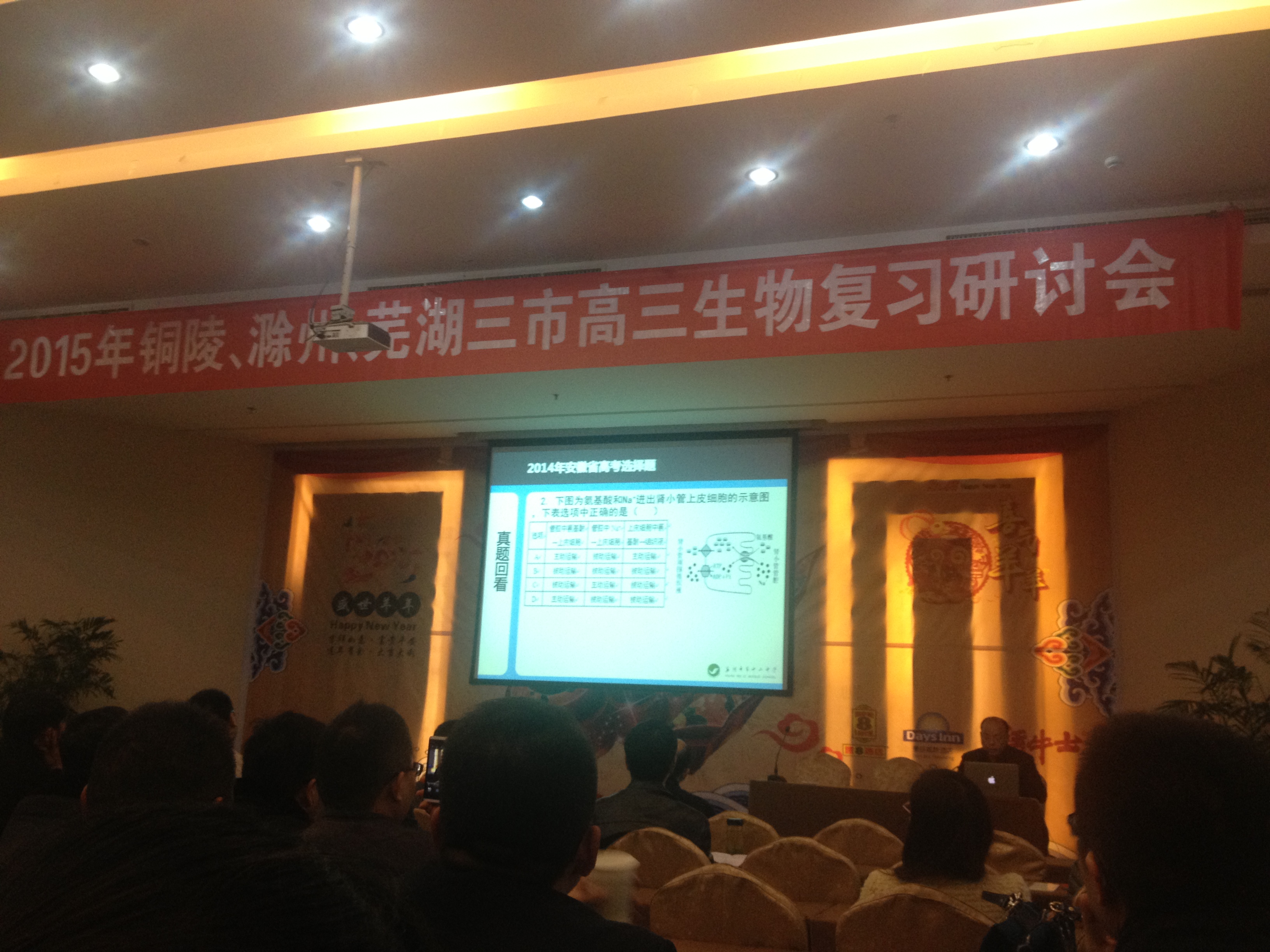 2015年3月26日至28日,我校生物教研组四名教师陆彦萍、徐盼、季学涛、陈茜参加了由芜湖市承办的的铜陵、滁州、芜湖三市2015年高中生物复习研讨会。
