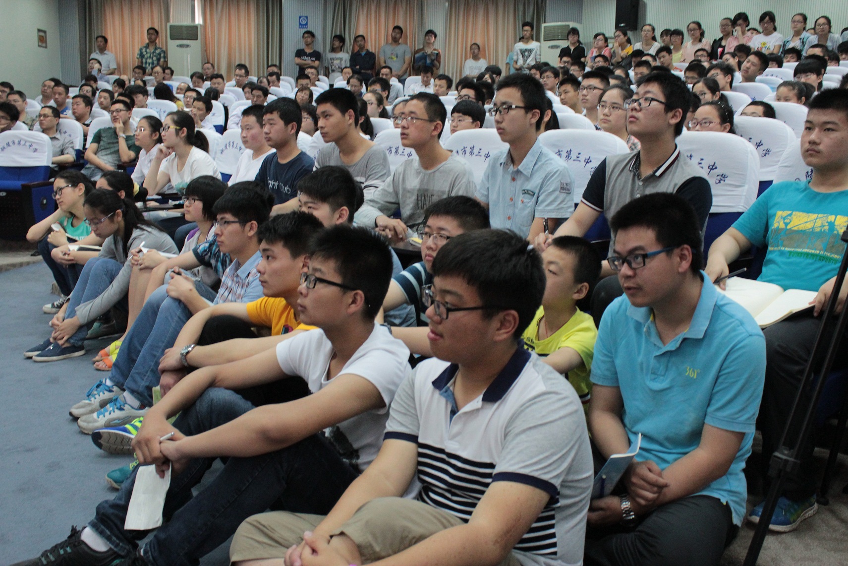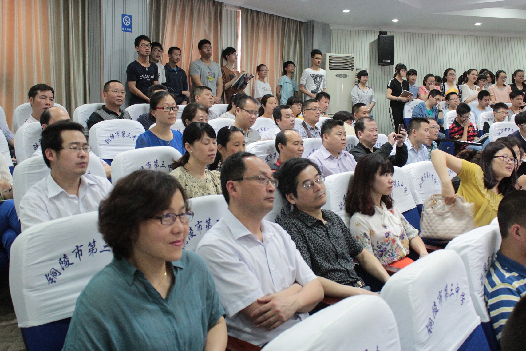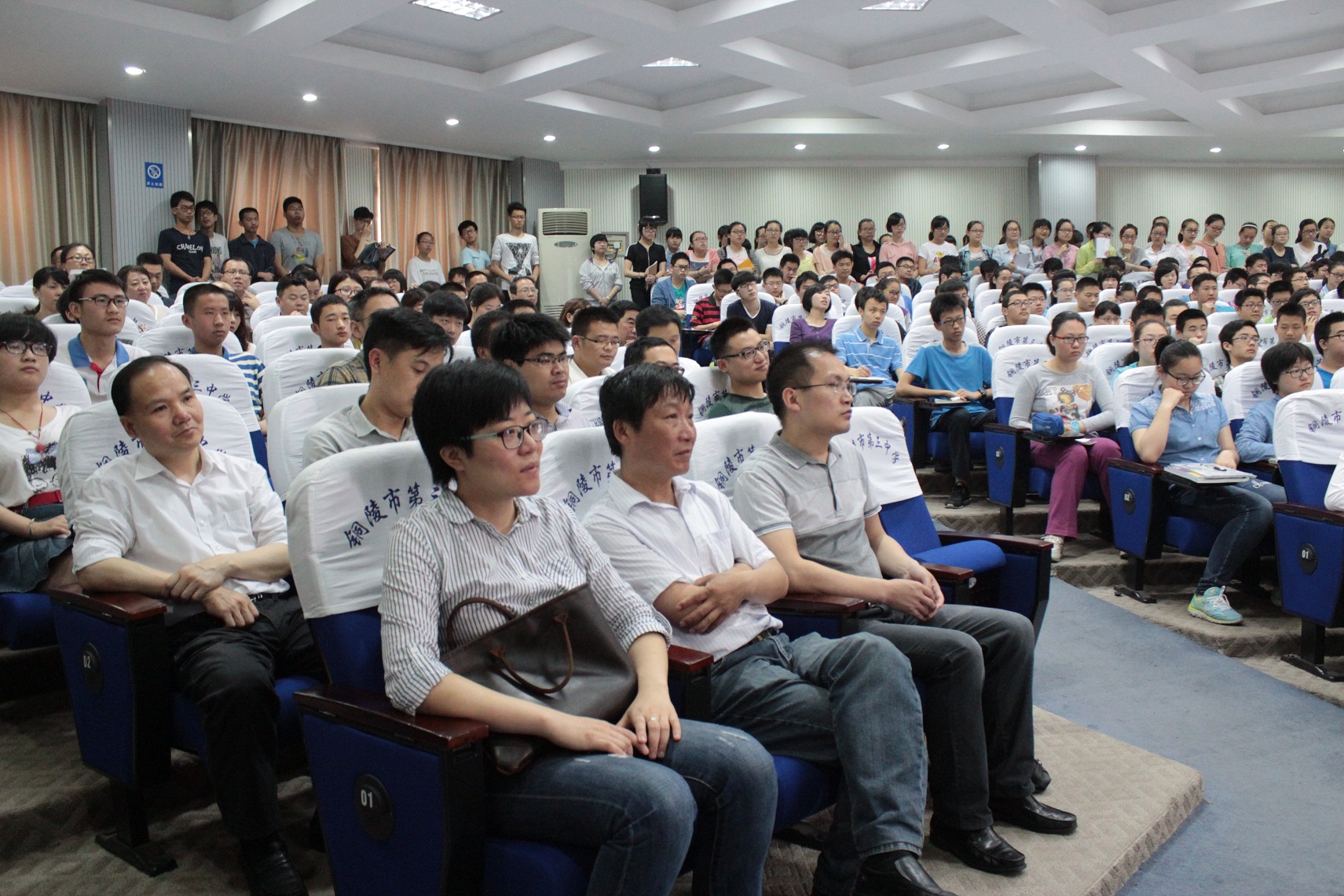 本校讯 应铜陵三中邀请,“数学帝”葛军教授于今天上午8点30分来我校与300多名师生见面,在多功能厅,能容纳300人的场地被挤得水泄不通,外校观摩者