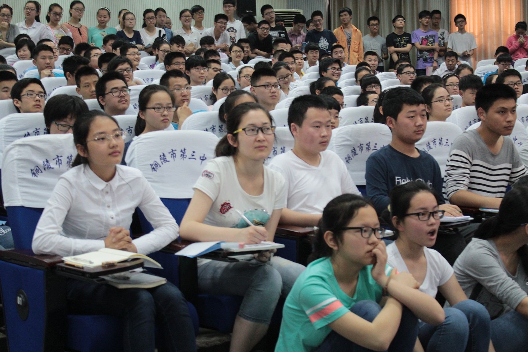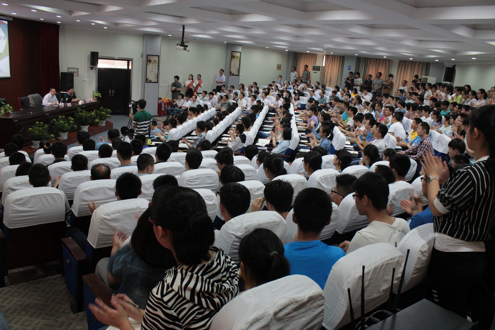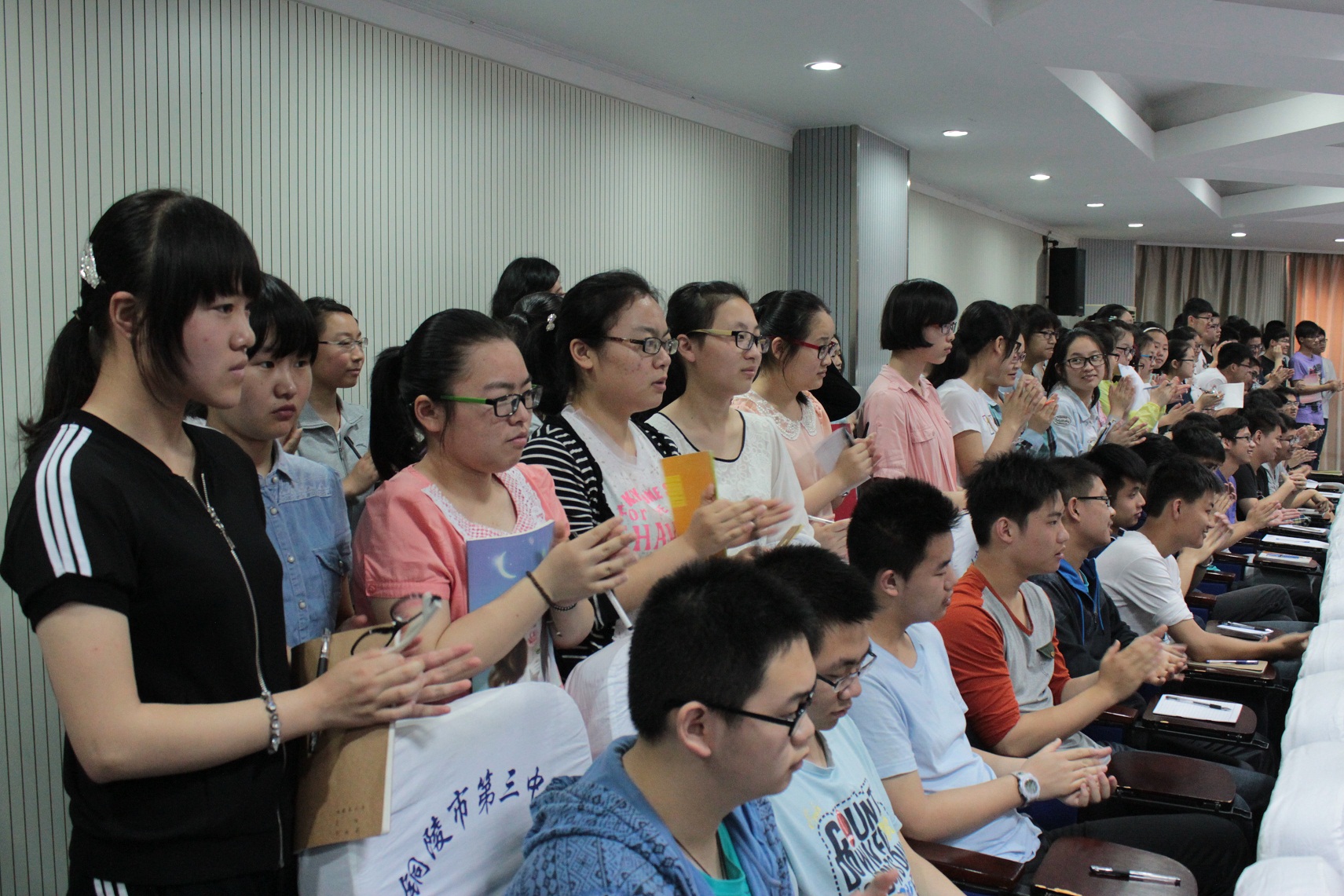 本校讯 应铜陵三中邀请,“数学帝”葛军教授于今天上午8点30分来我校与300多名师生见面,在多功能厅,能容纳300人的场地被挤得水泄不通,外校观摩者