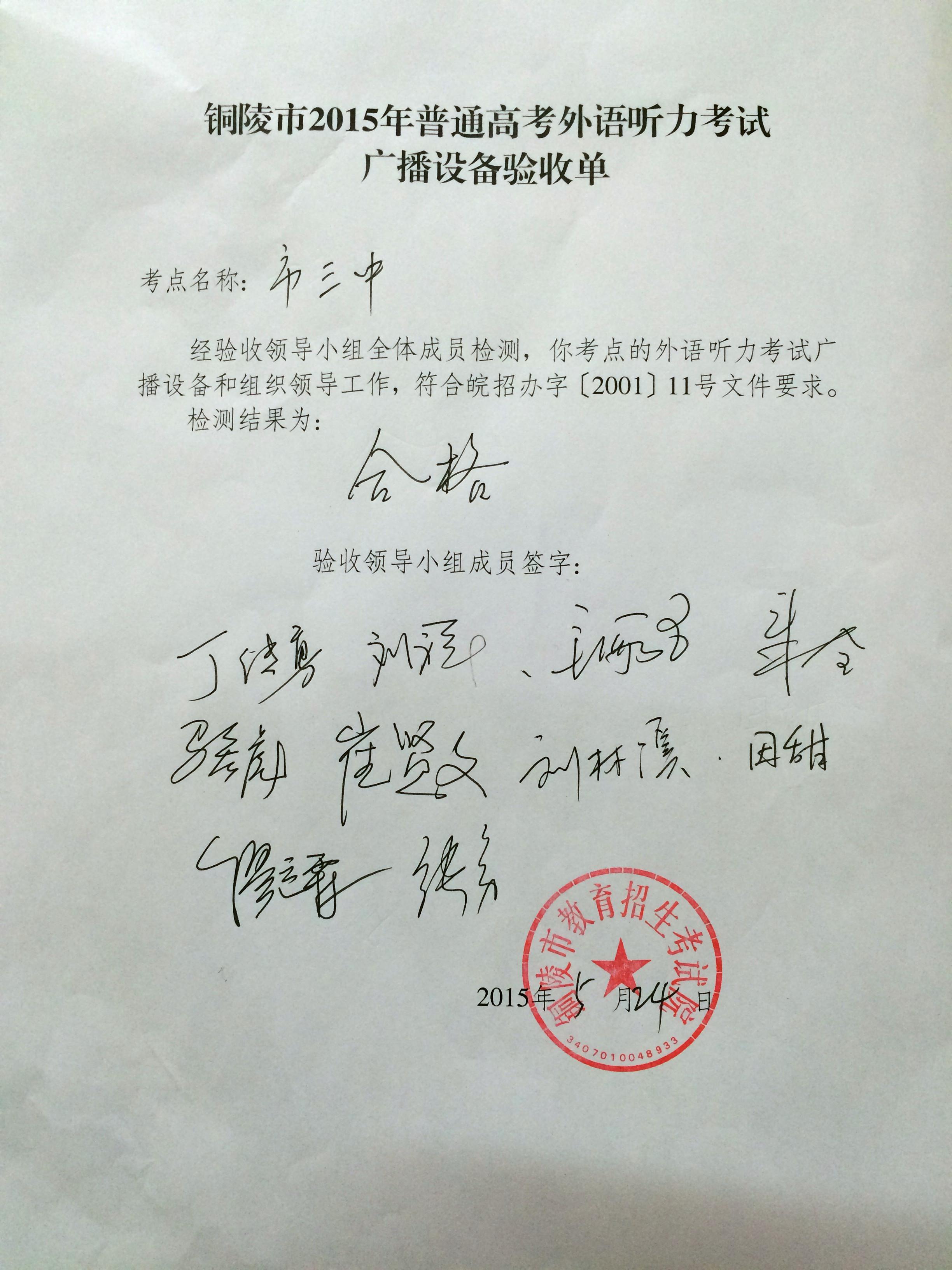 5月24日下午,市教育招生考试院副院长丁传勇、市教育局教仪站站长毛海名和监察室主任刘祥等一行,在副校长叶叶陪同下,对我校2015年普通高考外语听力考试广播设备进行检查验收,并对相关工作给予了充分的肯定。经验收领导小组全体成员检测,铜陵三中所设30个文史类考场外语听力考试设备和组织领导工作符合文件要求,检测合格,通过验收。