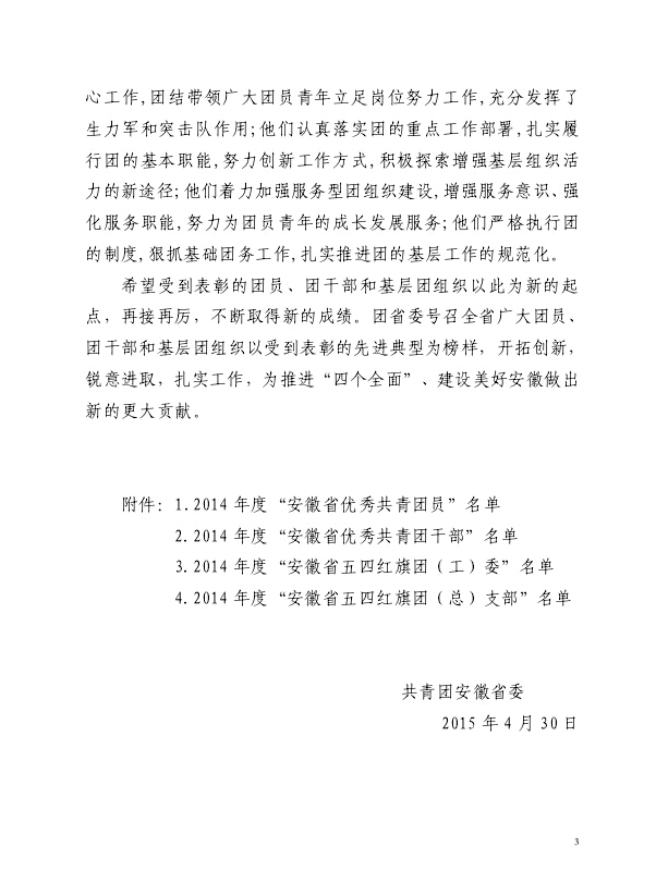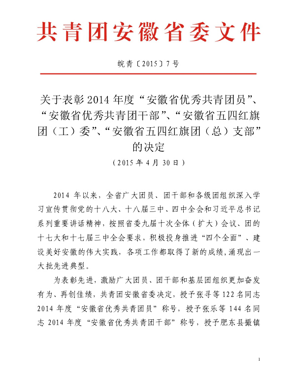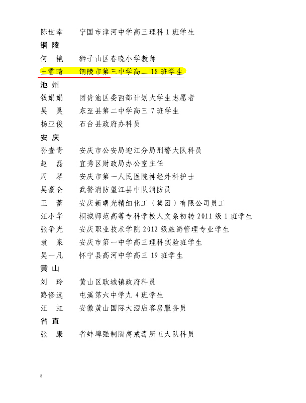 为树立青年学生中的先进典型,引导广大青年自觉成长为中国特色社会主义事业的合格建设者和可靠接班人,近期,共青团安徽省委对2014年度“两红两优”进行了评选表彰(皖青[2015]7号文)。我校高二18班王雪睛同学经过层层遴选,最终脱颖而出,荣获2014年度“安徽省优秀共青团员”称号。据悉,王雪晴同学是2014年度铜陵市唯一获此殊荣的学生。