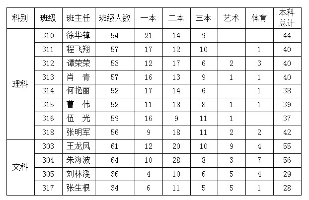 理科实验班308班(班主任:胡春林)本科达线率96.5%(班级人数57人,本科达线55人),其中一本达线率71.9%(一本达线41人),600分以上18人。
