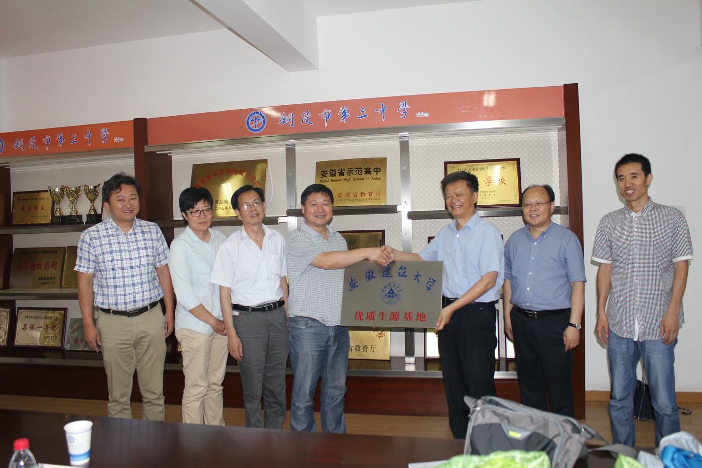 近日,安徽建筑大学党委书记杨兵、建筑与规划学院院长储金龙、建筑与规划学院党委副书记斯方龙一行访问我校,并向我校授牌“安徽建筑大学优质生源基地”。我校校长钟士标、市教育局副局长管清华、三中副书记吴翀、副校长叶叶等出席了活动,双方签署了协议,并合影留念。