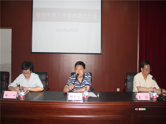 为了贯彻市教育局《关于在市直教育系统县处级以上领导干部中开展“三严三实”专题教育实施方案》的文件精神,6月3日下午,铜陵三中召开了“三严三实”专题教育布置会。会议由校党总支书记、校长钟士标主持,党总支副书记吴翀、副校长叶叶及全体教职工参加了会议。