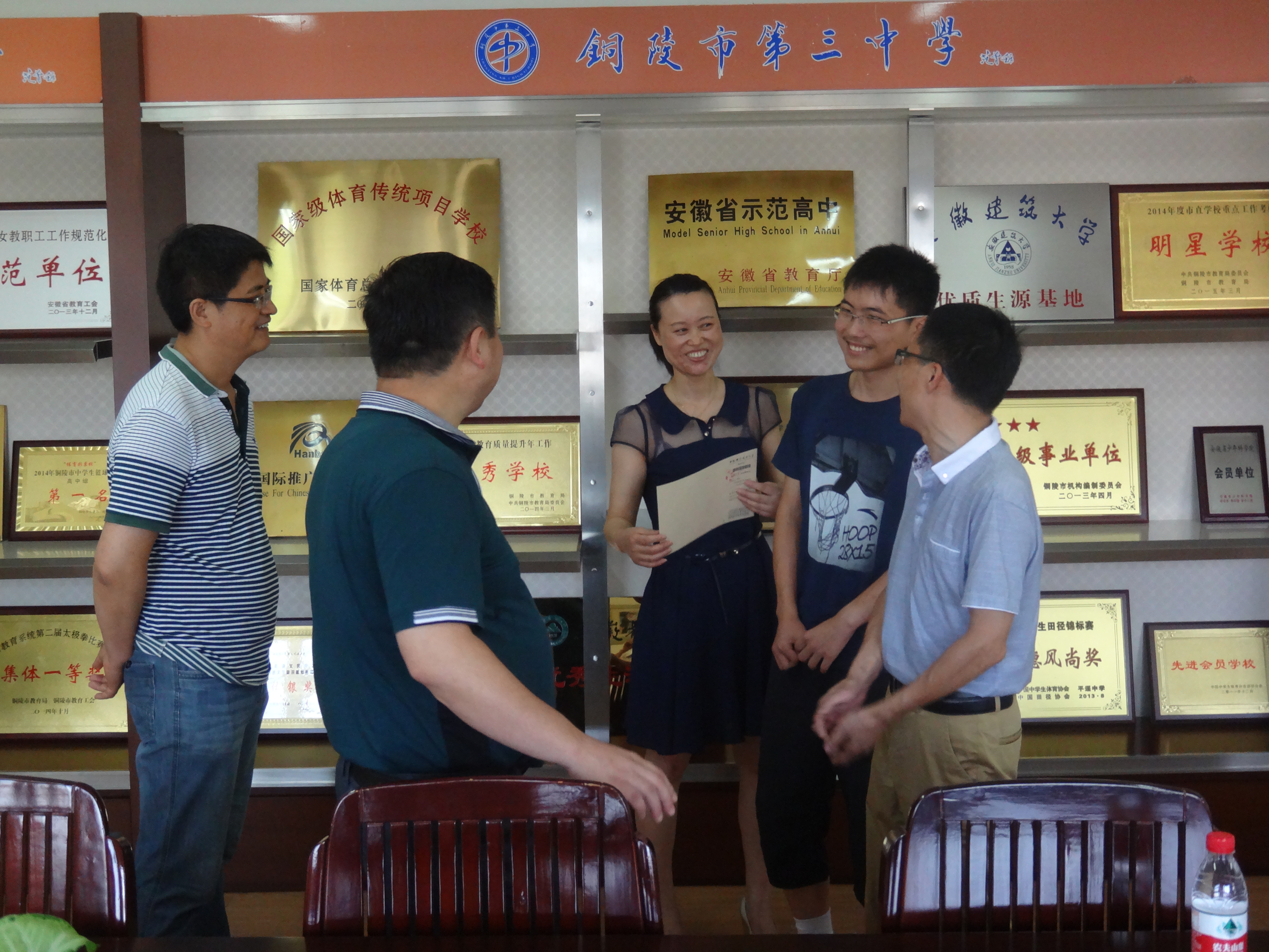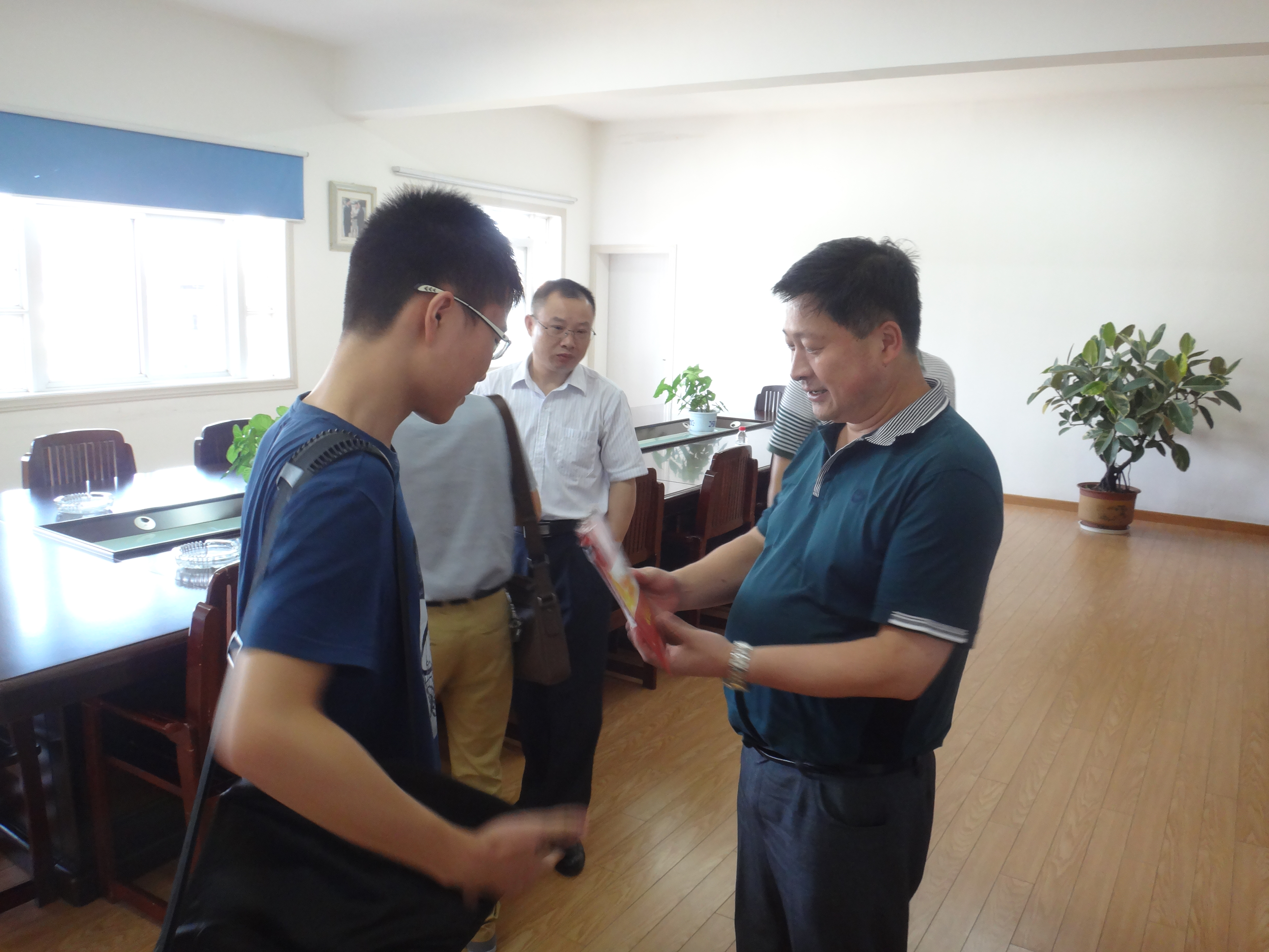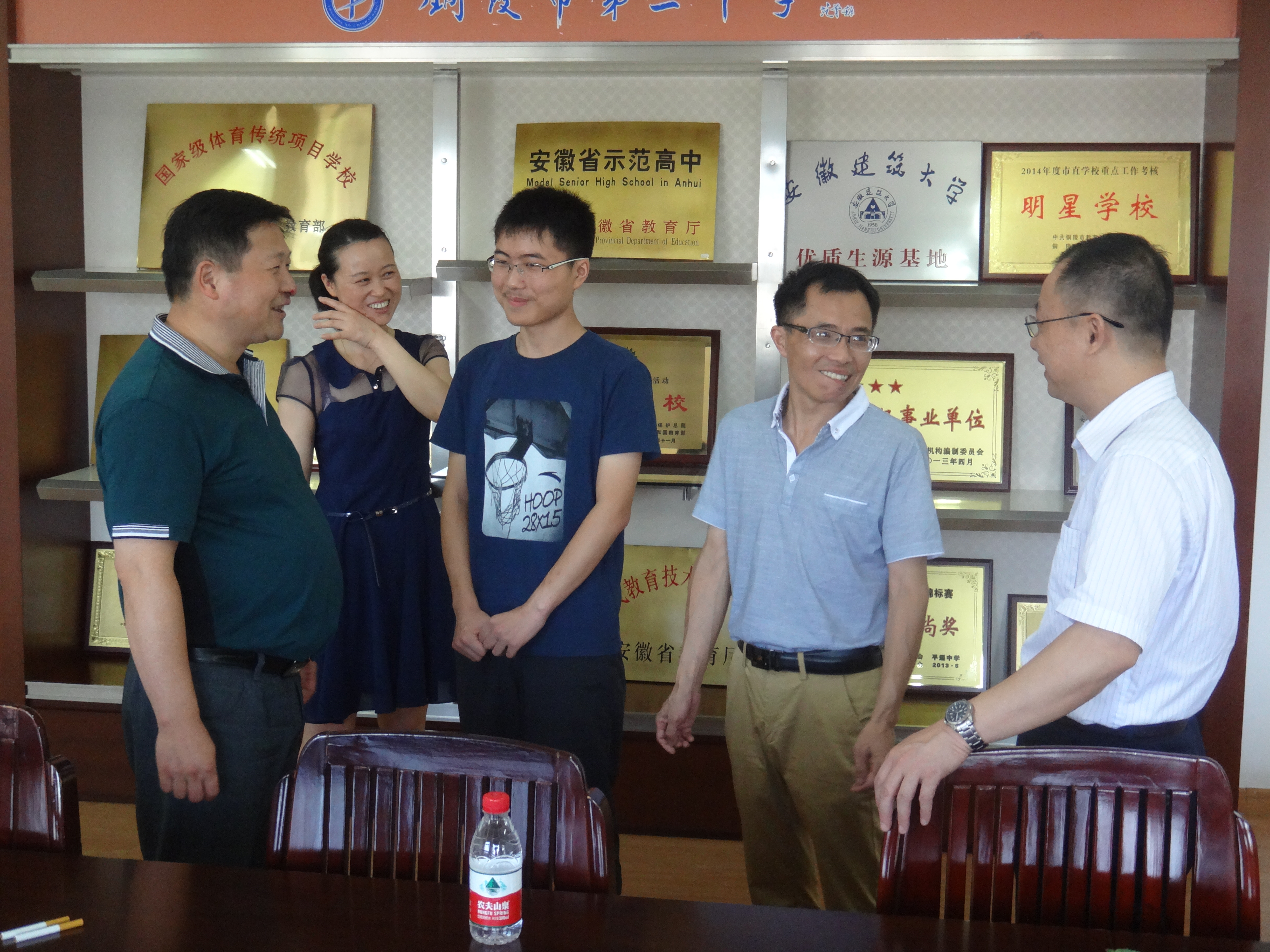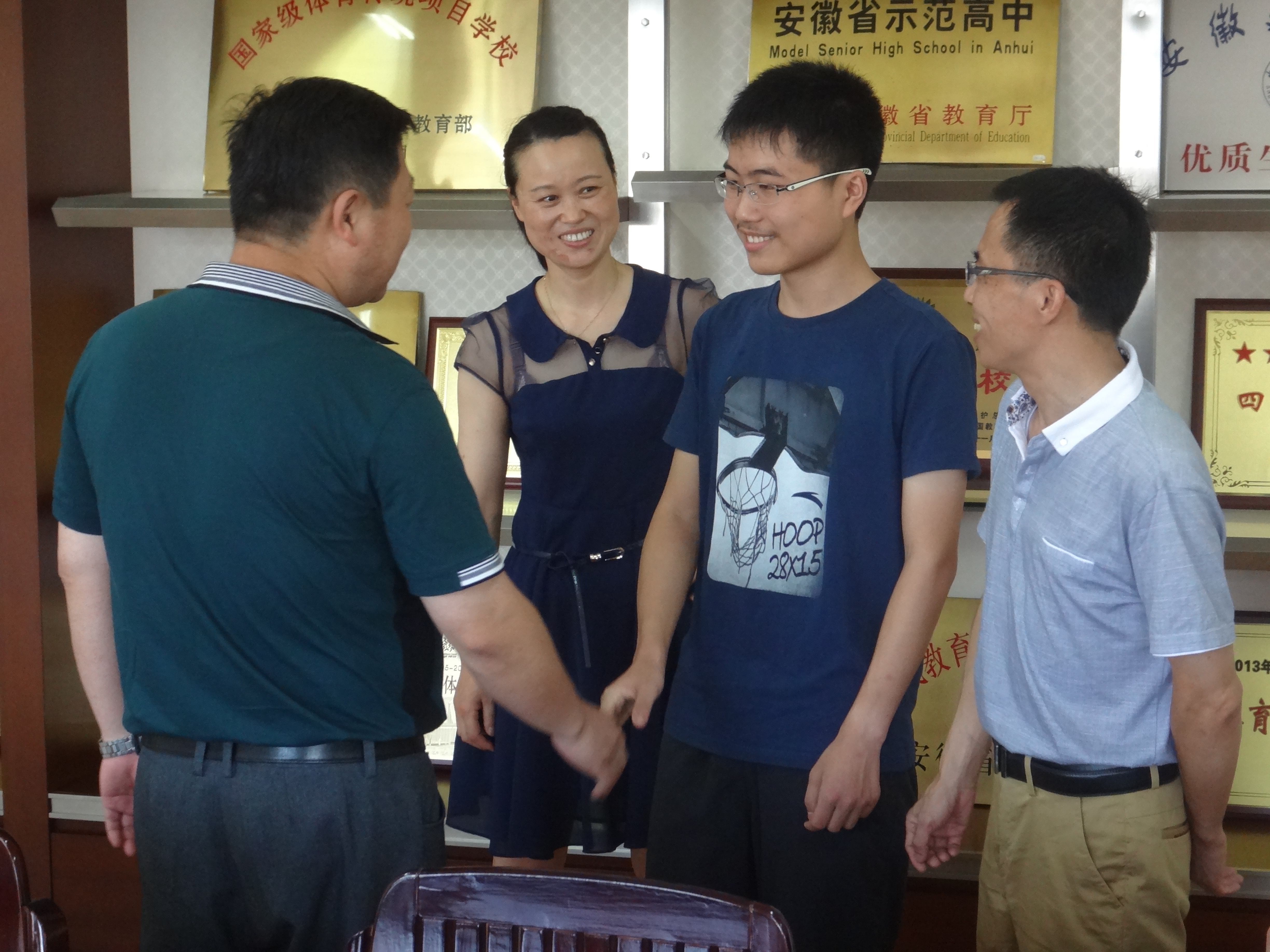 7月29日上午,洋溢着满脸幸福的高二实验小班孙致远一家人来到学校会议室,将收到中科大少年班录取通知书的喜讯向校长钟士标和班主任杨春生汇报。