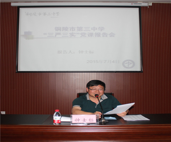 7月4日上午,铜陵市第三中学举办了“三严三实”专题党课报告会,报告会由校党总支书记钟士标同志主讲,党总支副书记吴翀、副校长叶叶及全体教职工参加了报告会。