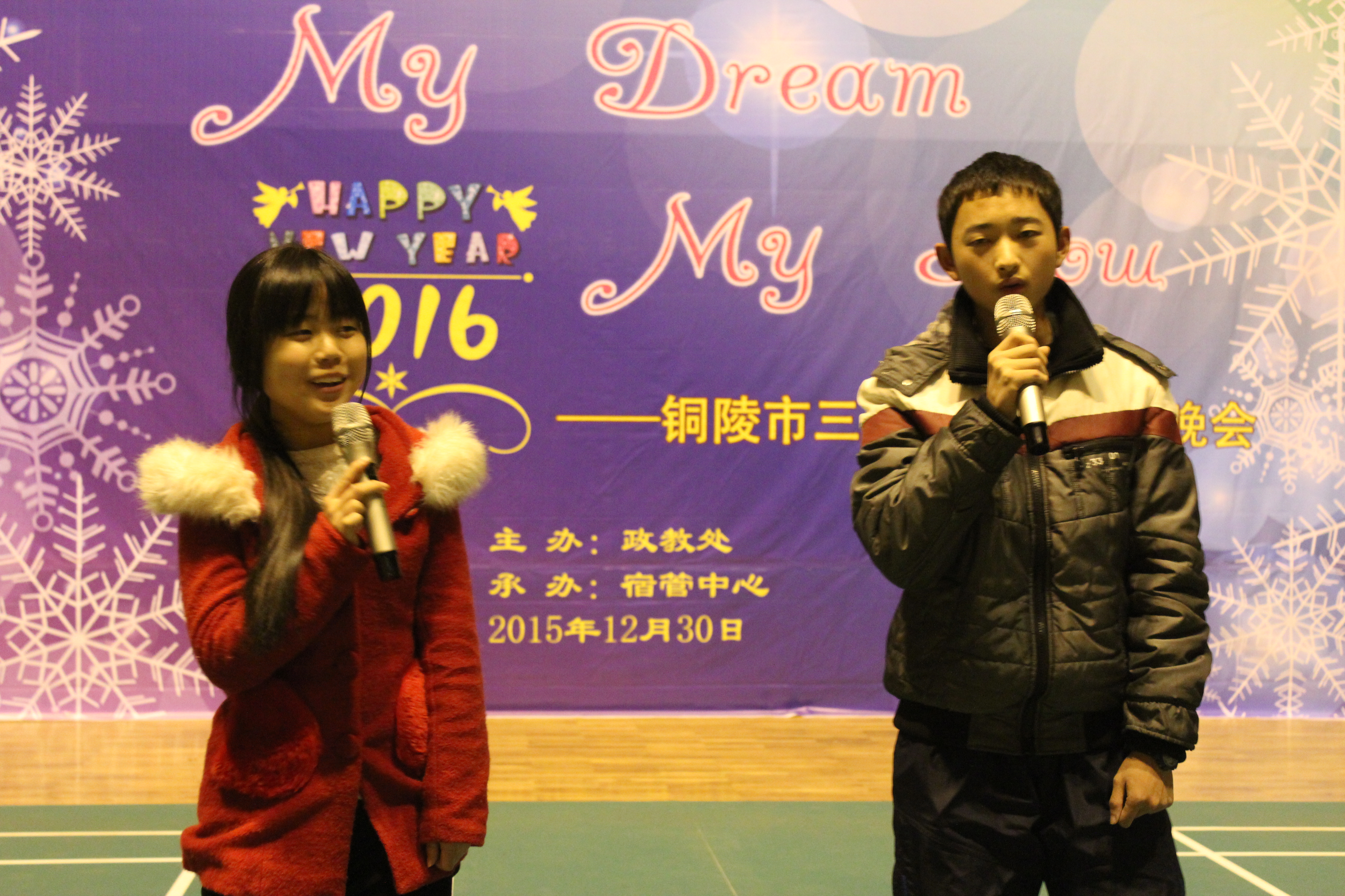 许下一个愿望,2016我们来啦。2015年12月30日晚,铜陵市三中体育馆灯火通明,由政教处主办,宿管中心承办的以“MY DREAM MY SHOW ”为主题的迎接2016新年晚会在这里举行,高一、高二年级的住校生参加了这次活动。晚会开始,进行了2015年度文明标兵,示范宿舍及优秀宿舍的表彰,特邀嘉宾王龙凤老师为钱澳薇等10名学生及301宿舍等8个宿舍颁发了证书和奖品。面对即将到来的2016年,住校生们每个人都许下了一个心愿,他们怀揣感恩,将祝福洒向身边的同学、老师及远方的亲人;他们怀抱梦想,用歌声表达对未来的憧憬;他们自创诗歌,自编游戏,精心编排历史剧,用一个个精彩的瞬间展示着住校生的才能和才艺,也将晚会推向了高潮。
