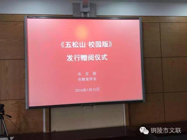元月15曰下午,《五松山·校园版》发行赠阅仪式在教育局会议室举行,市文联党组书记、主席李云,市教育局副局长程克勤,铜陵市中职中心、铜陵市2中、铜陵市3中、铜陵市4中、铜陵市5中、铜陵市6中、铜陵市7中、铜陵市9中、铜陵市10中等学校的负责人和铜官山区、义安区、郊区、枞阳县教育局负责人以及学生代表40余人参加。