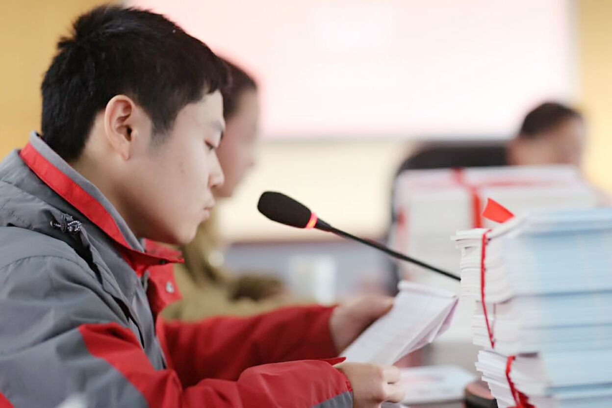 我校梁波科长代表学校接受赠阅,高213班胡文嵌同学作为作者代表发言。