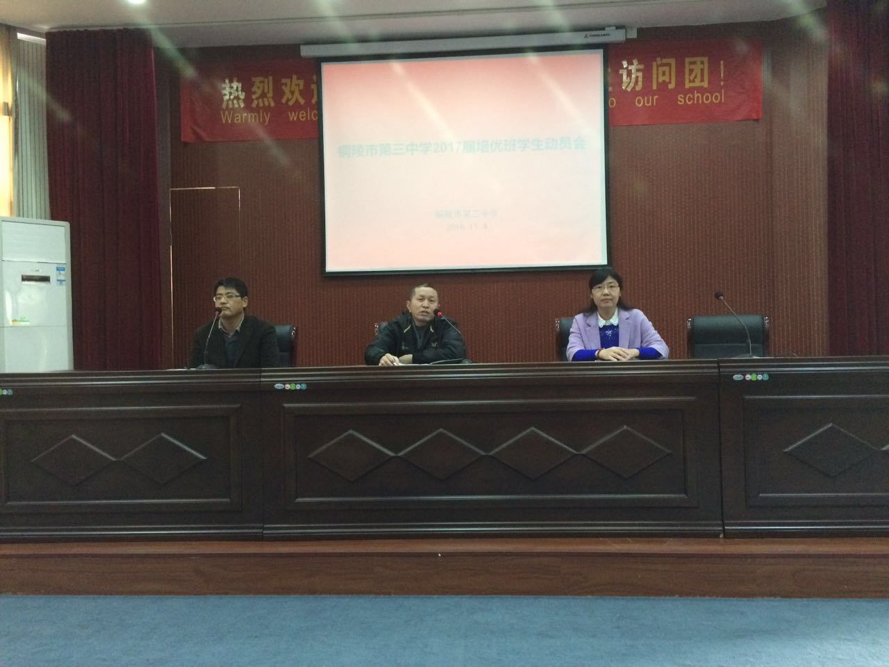 2016年11月4上午,教务处在校多功能厅召开2017届高三年级培优班学生动员会。教务处主任张尤俊、高三年级部部长胡晨、培优班班主任冯定育参加会议,冯定育老师主持会议。