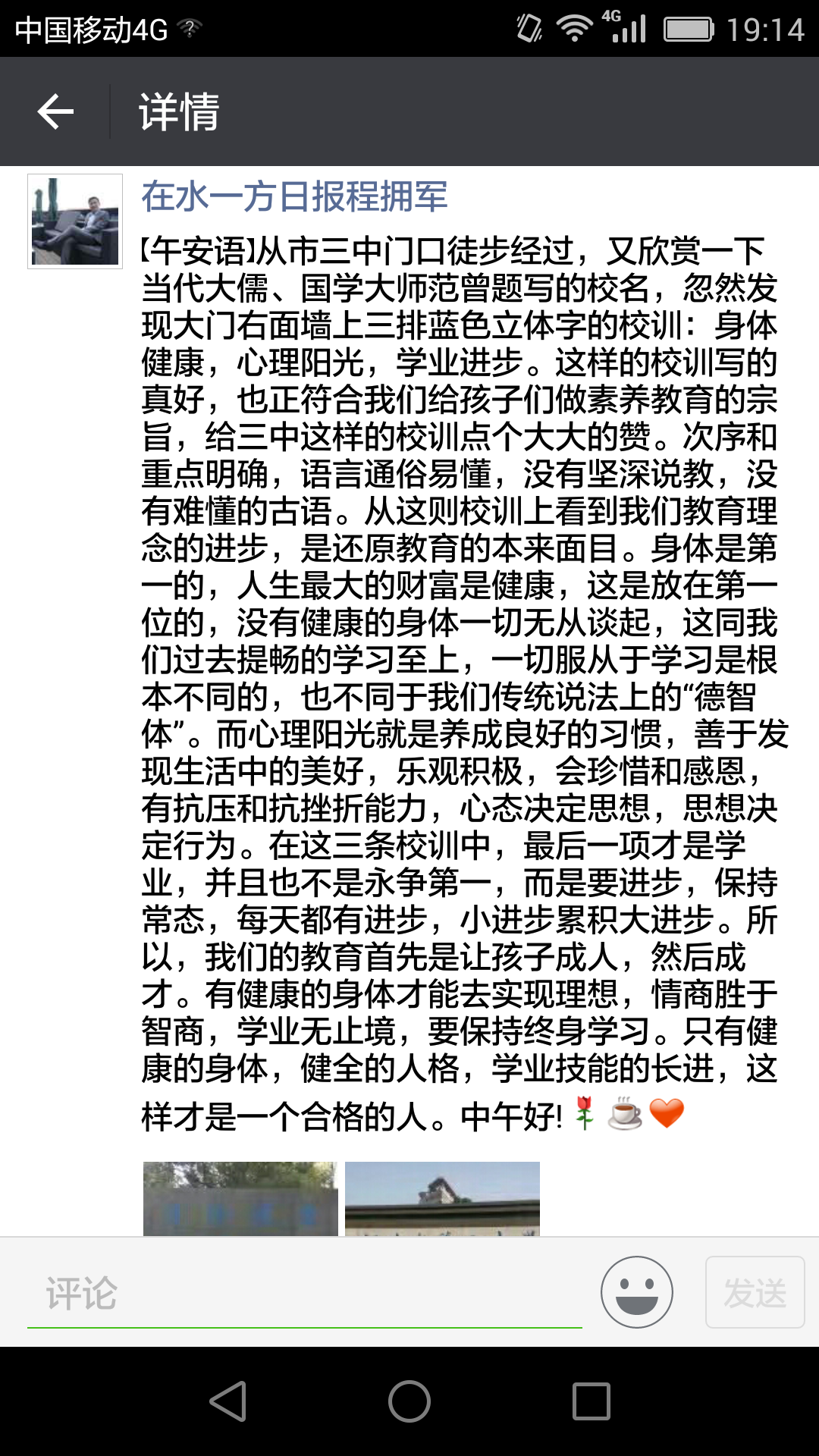 【午安语】从市三中门口徒步经过,又欣赏一下当代大儒、国学大师范曾题写的校名,忽然发现大门右面墙上三排蓝色立体字的校训:身体健康,心理阳光,学业进步。这样的校训写的真好,也正符合我们给孩子们做素养教育的宗旨,给三中这样的校训点个大大的赞。次序和重点明确,语言通俗易懂,没有坚深说教,没有难懂的古语。从这则校训上看到我们教育理念的进步,是还原教育的本来面目。身体是第一的,人生最大的财富是健康,这是放在第一位的,没有健康的身体一切无从谈起,这同我们过去提畅(倡)的学习至上,一切服从于学习是根本不同的,也不同于我们传统说法上的“德智体”。而心理阳光就是养成良好的习惯,善于发现生活中的美好,乐观积极,会珍惜和感恩,有抗压和抗挫折能力,心态决定思想,思想决定行为。在这三条校训中,最后一项才是学业,并且也不是永争第一,而是要进步,保持常态,每天都有进步,小进步累积大进步。所以,我们的教育首先是让孩子成人,然后成才。有健康的身体才能去实现理想,情商胜于智商,学业无止境,要保持终身学习。只有健康的身体,健全的人格,学业技能的长进,这样才是一个合格的人。中午好!