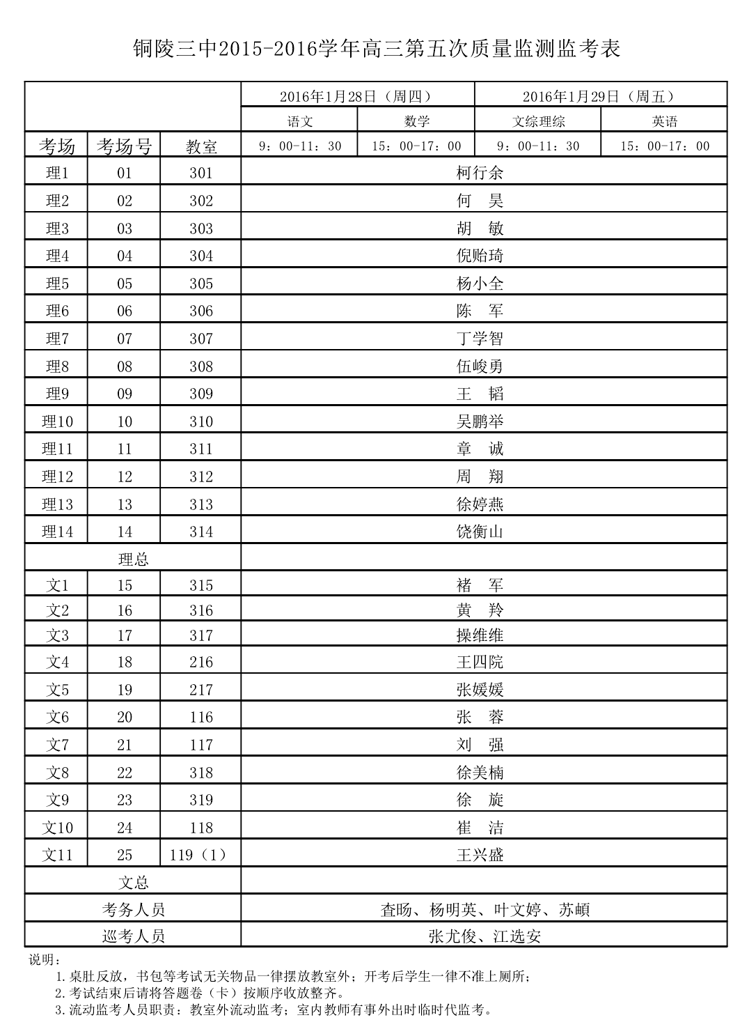 铜陵三中2015-2016学年高三第五次质量监测监考表