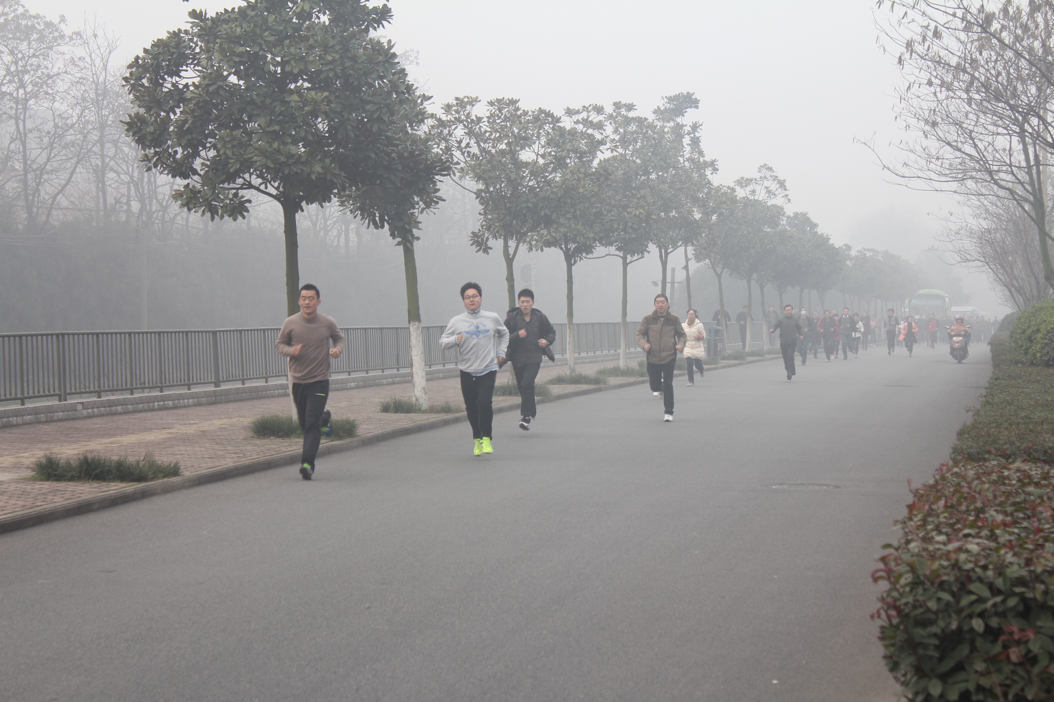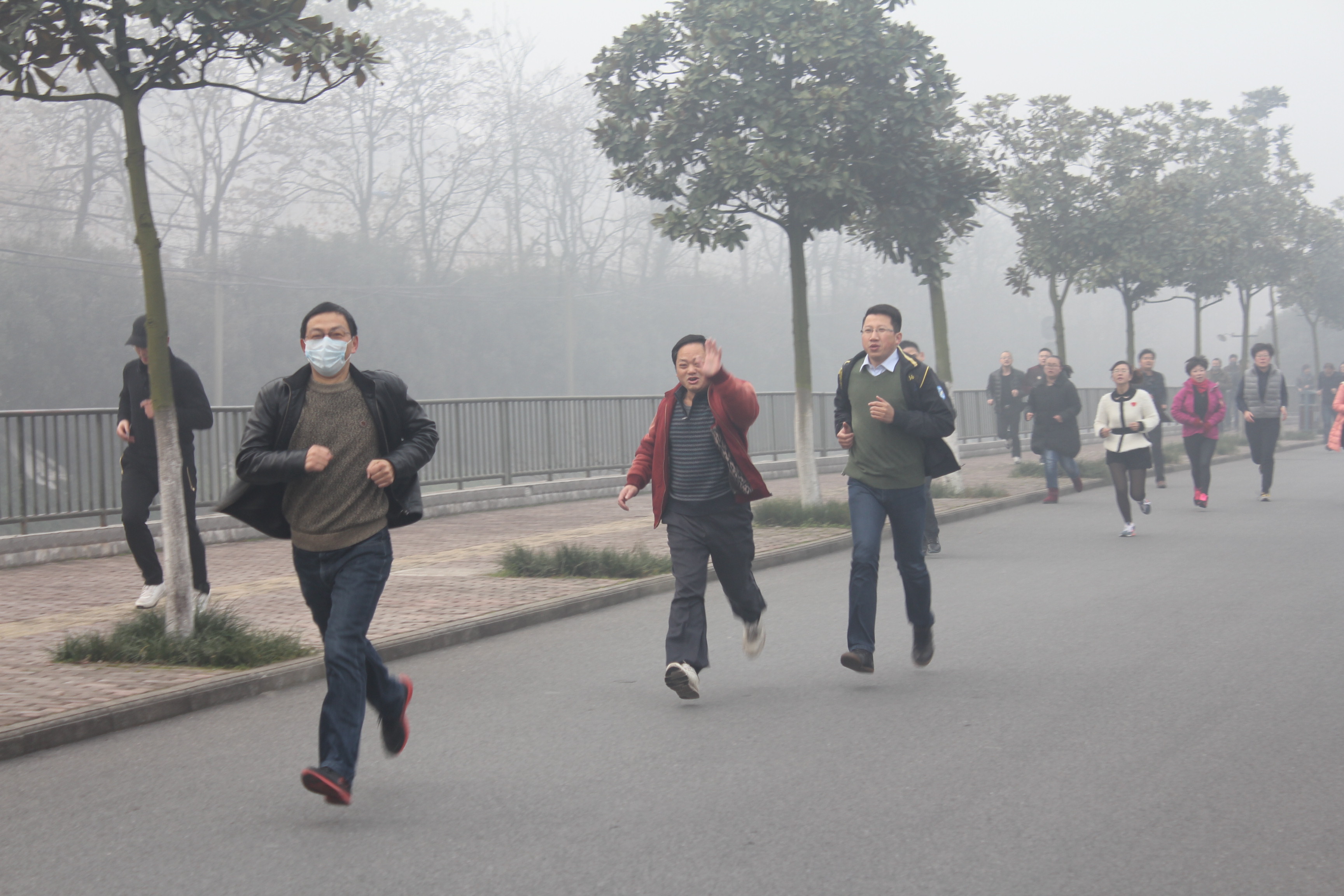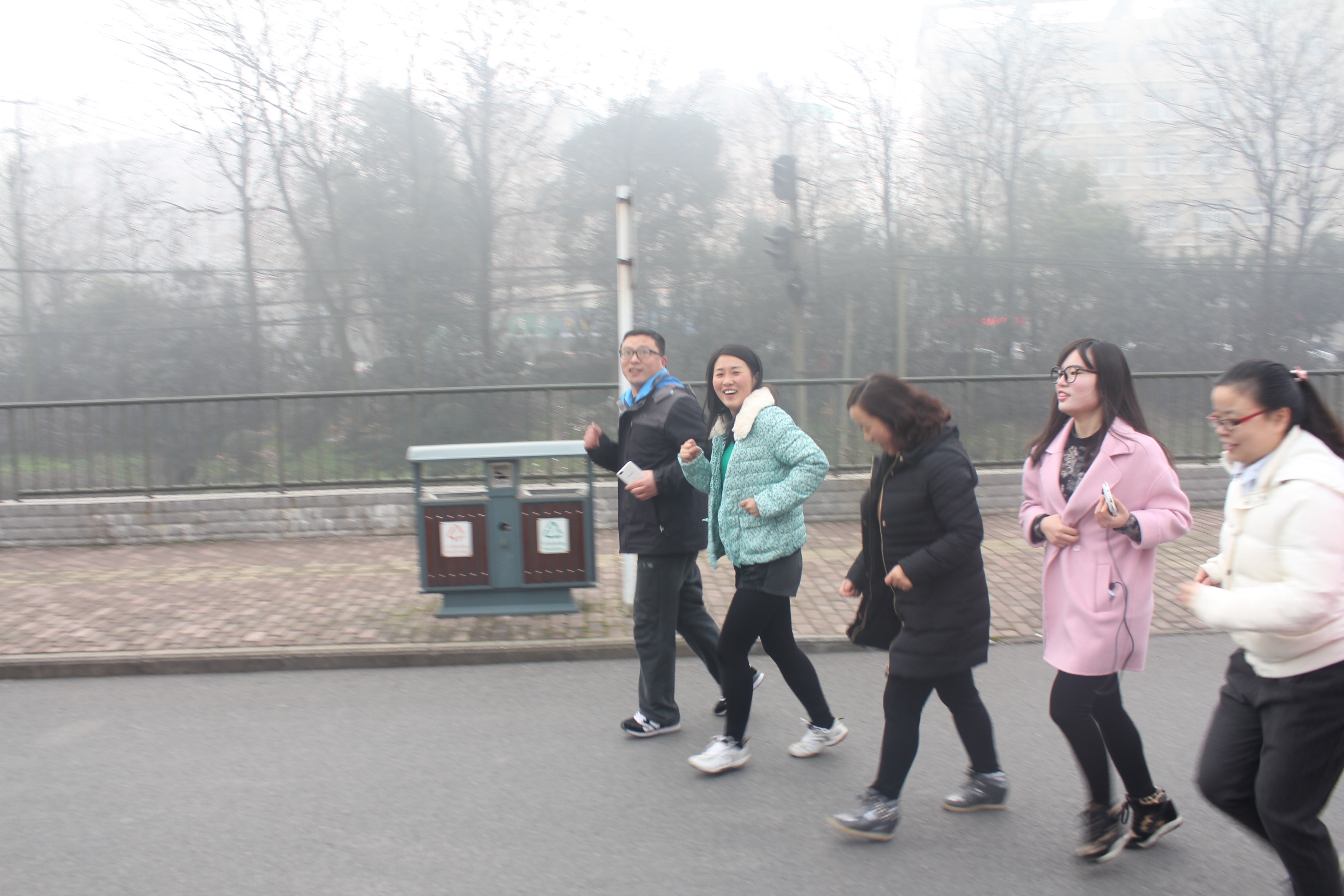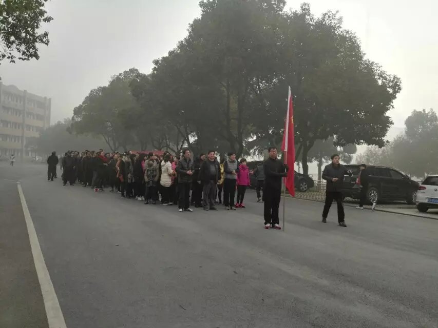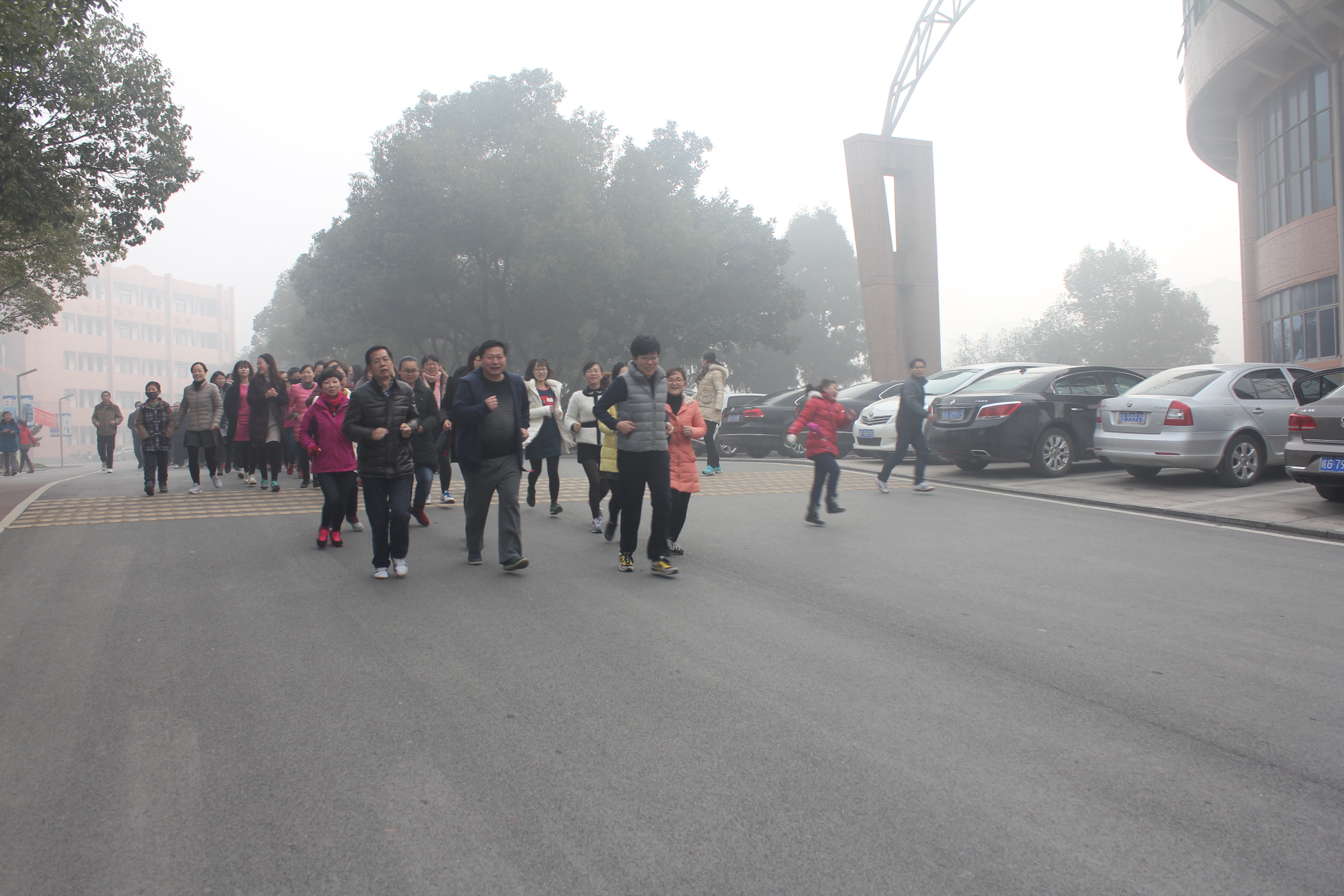 1月1日的清晨,雾气蒙蒙,在晨光微现的三中校园,全校教职工已经整装待发,准备进行一年一度的新年长跑活动。雾天没有阻碍老师们昂扬的精神,随着开始令下,浩浩荡荡的队伍出发了。