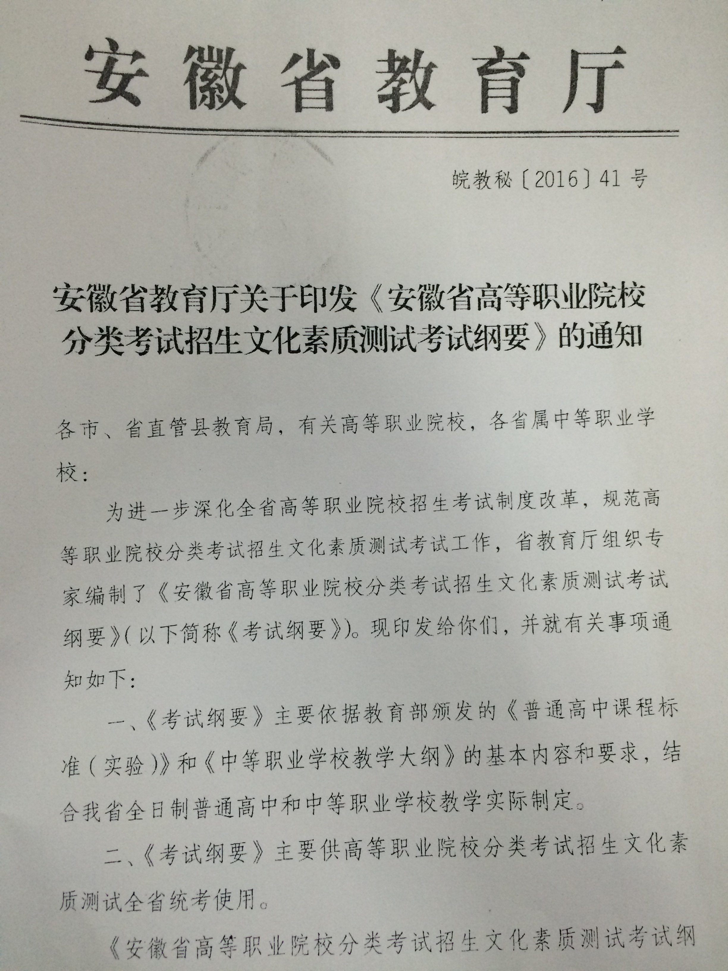 安徽省教育厅关于印发《安徽省高等职业院校分类考试招生文化素质测试考试纲要》的通知