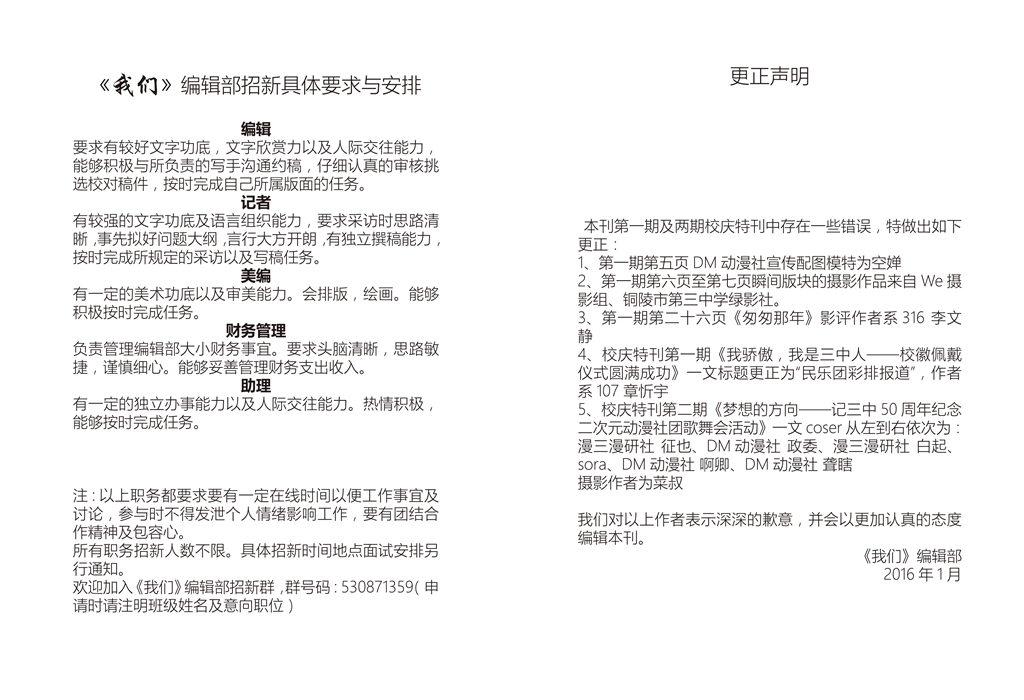市三中校报《我们》于2015年10月改版重组,目前编辑部由高一、高二年级共40位成员组成,高一(1)班王玥同学任主编。《我们》是一支富有朝气,充满热情,才华横溢,勇于创新的团队,自改版重组以来已顺利发行四期校报(两期主刊和两期三中建校50周年纪念活动专刊),发行量达12400册,内容主要涵盖“视角”、“瞬间”、“三中—社团”、“最真实的声音”、“知乎”、“文韵千秋”、“雁过留声”等7个栏目,其集“原创性、时效性、真实性、文艺性、思想性”为一体的办刊特色深受广大师生好评。