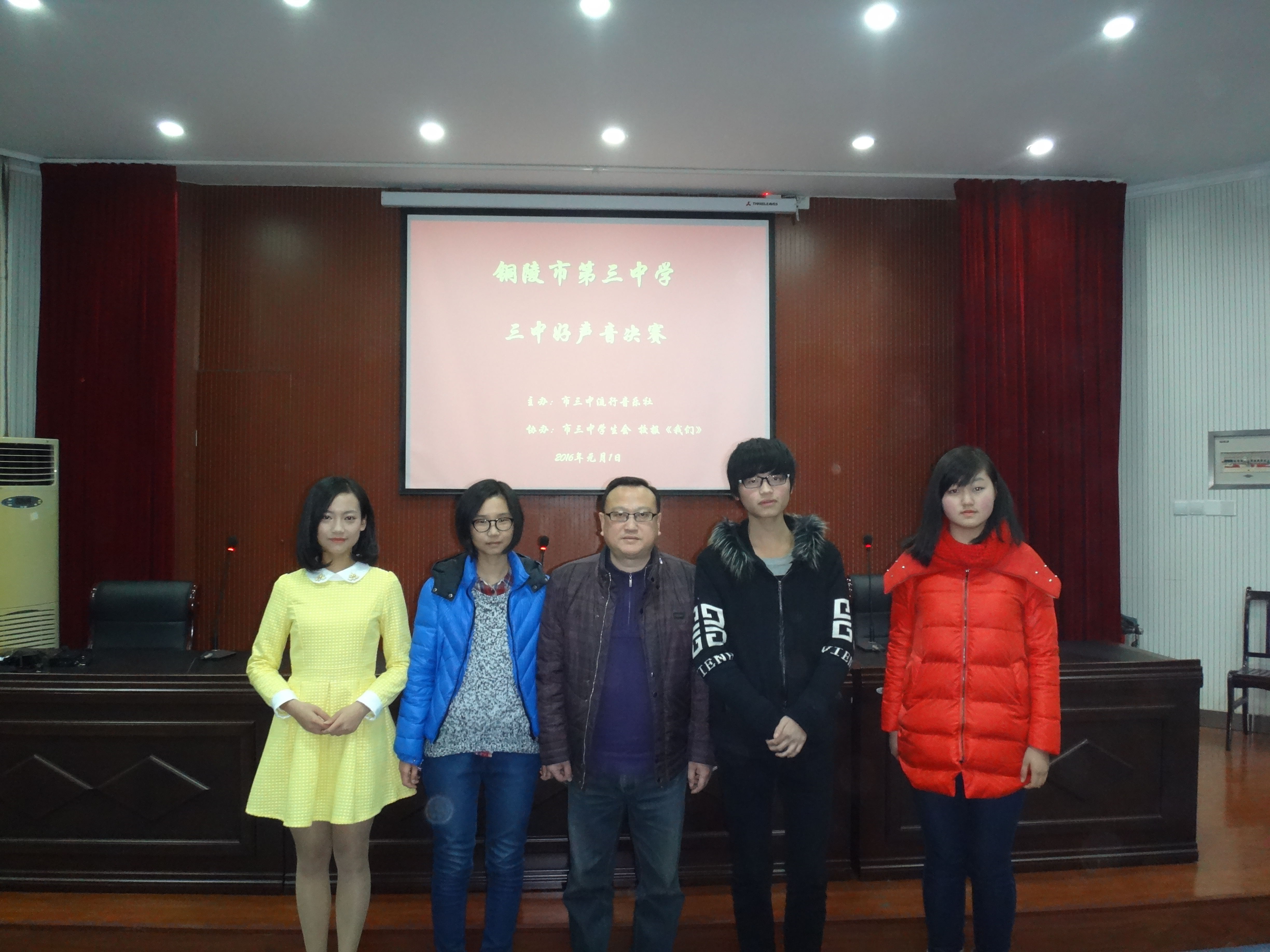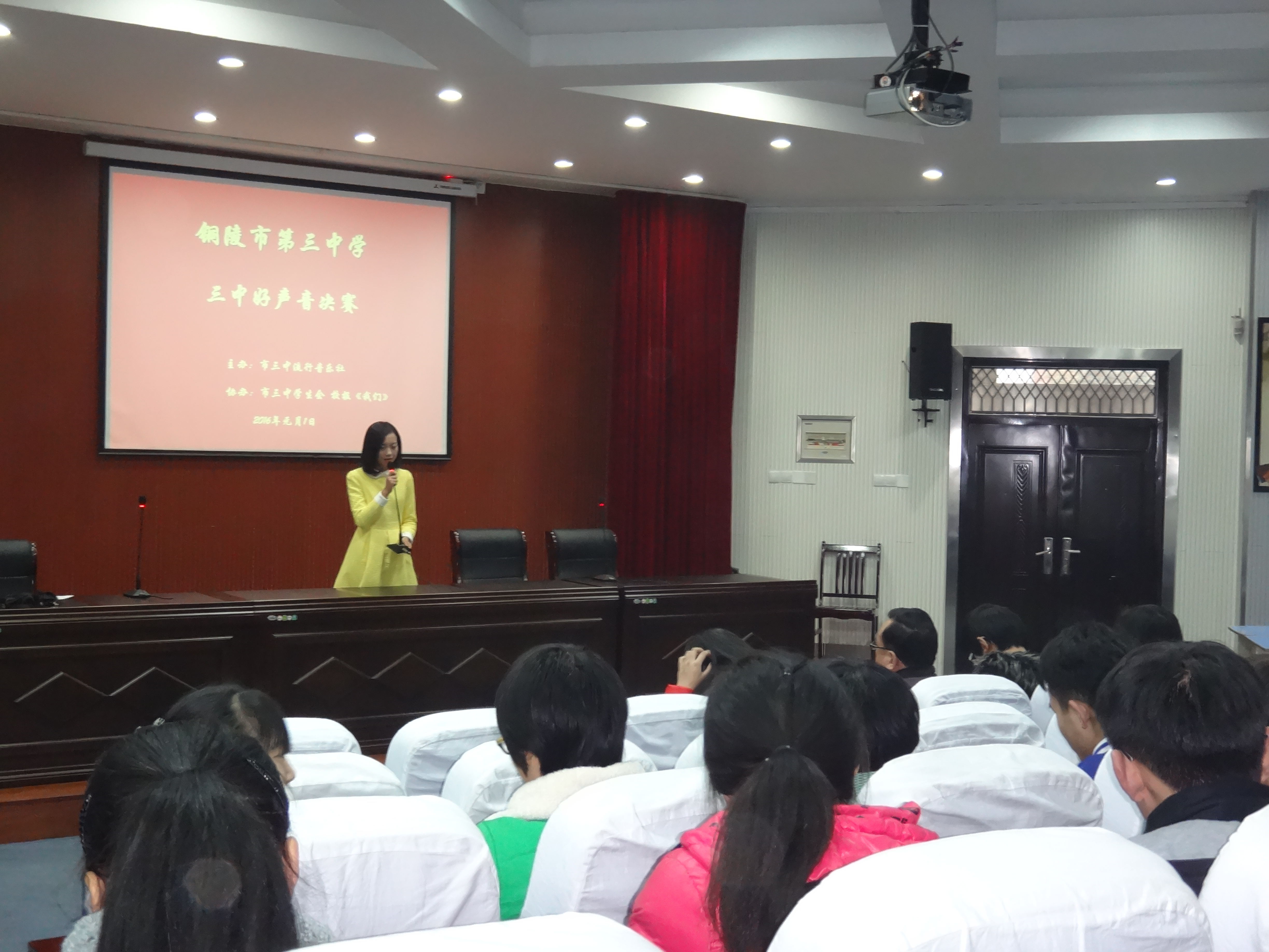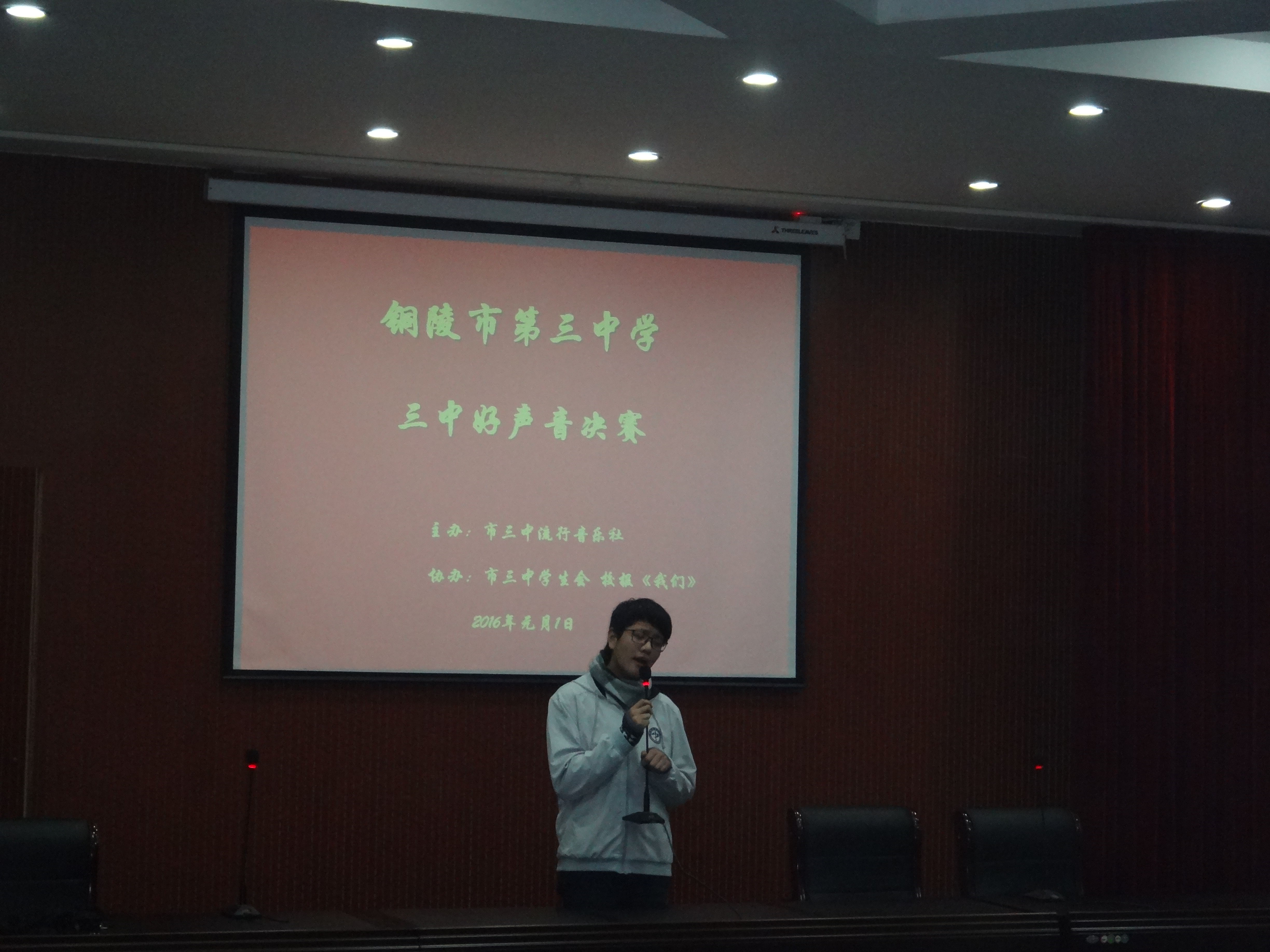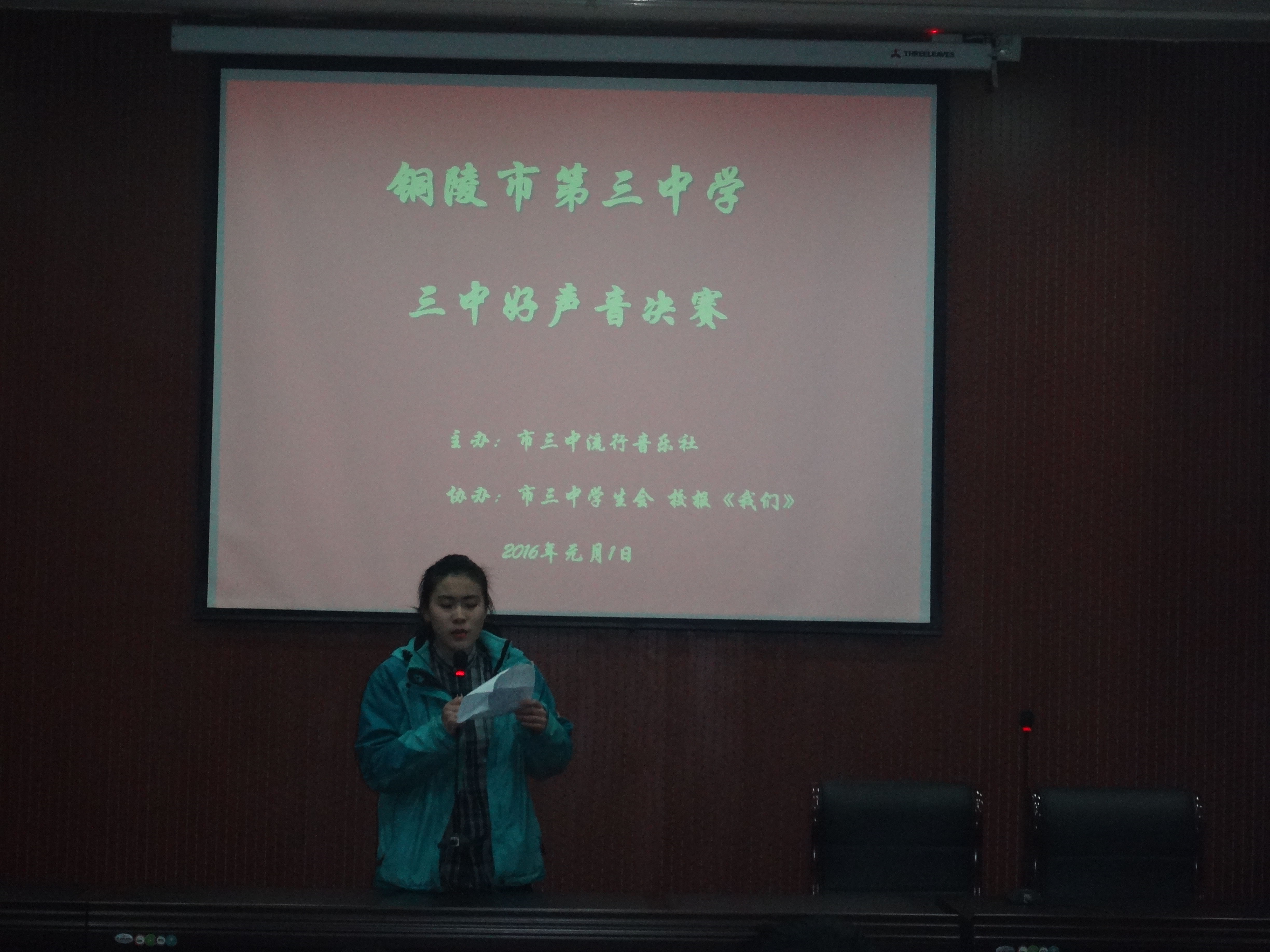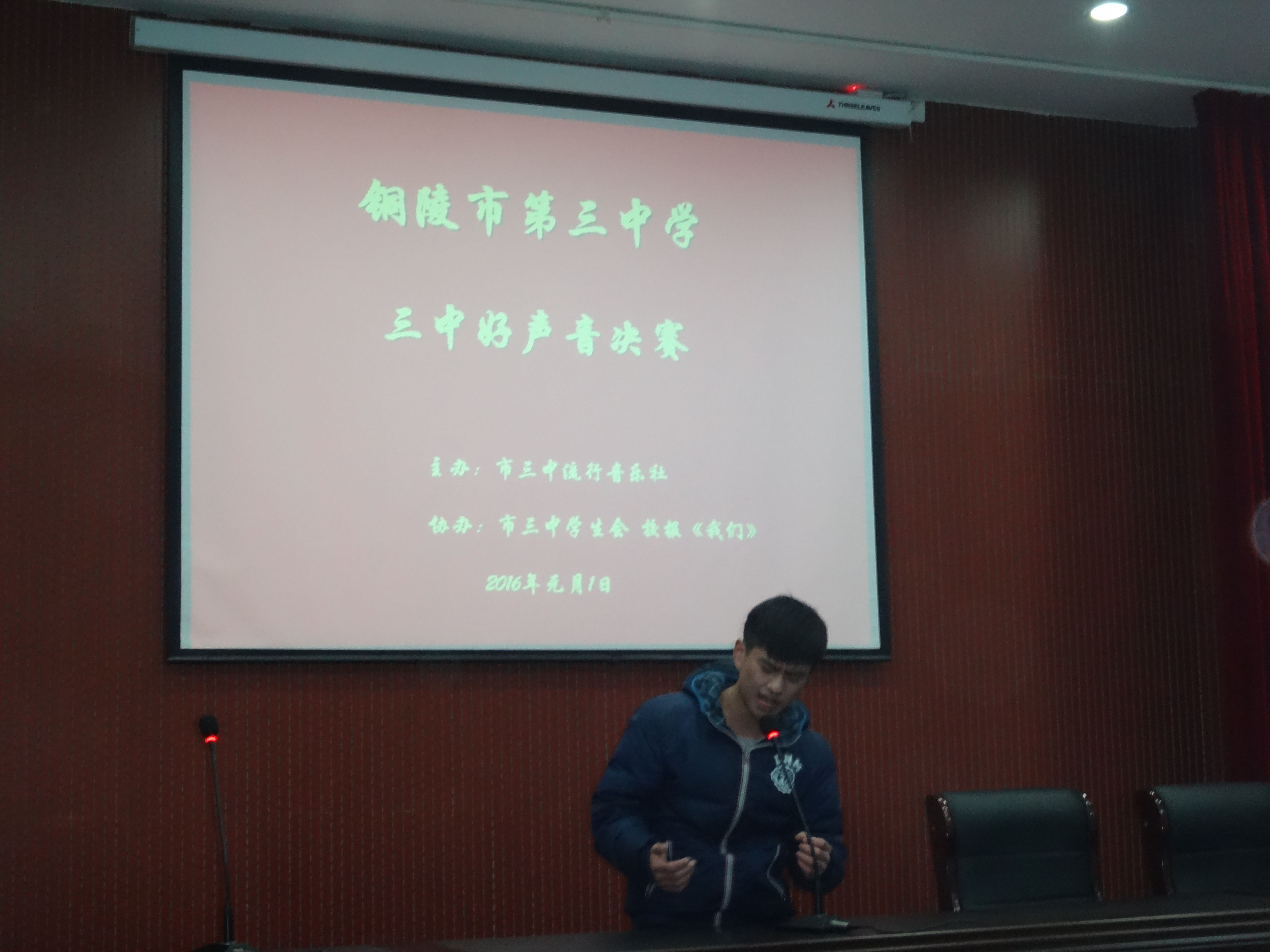 2016年来临之际,为丰富校园文化生活,给学生展现自我,放飞青春的机会,市三中流行音乐社于2016年元月1日在校多功能厅成功举办了市三中首届“三中好声音”校园歌唱比赛。本次活动由铜陵市声乐协会副会长,市三中艺术组组长尹向前老师和三名高二学生担任评委。