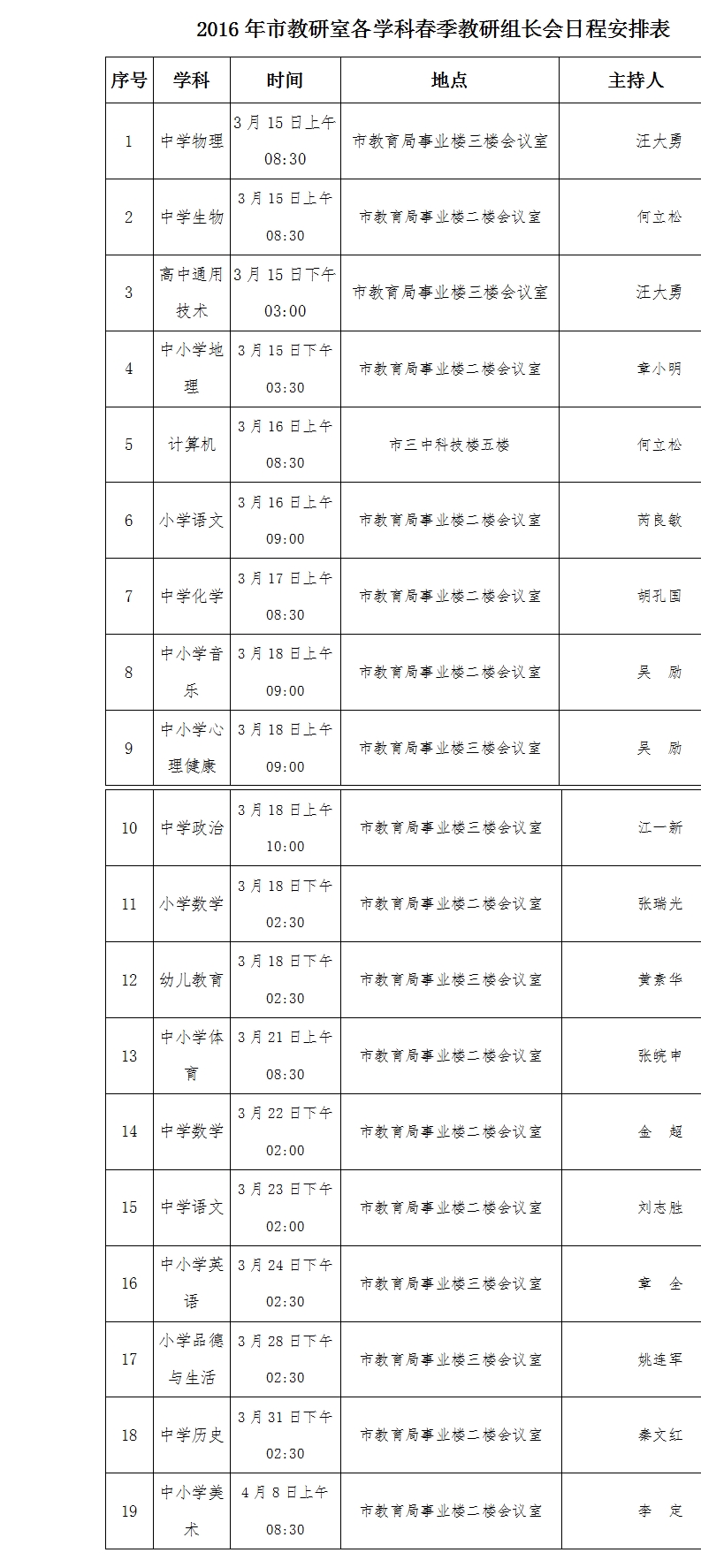 2016年市教研室各学科春季教研组长会日程安排表