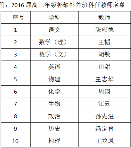 2015年11月,在总结上一年补缺补差班经验和不足的基础上,校领导决策、教务处和高三年级部具体部署实施新一届高三补缺补差班的培训学习工作,择优聘选经验丰富、精力充沛的中青年教师和班主任,确保补缺补差工作取得显著成效,让学生真正受益,力争有更多的尖子生在2016年高考中录取到名校,从而提升学校的办学品牌和社会影响力。