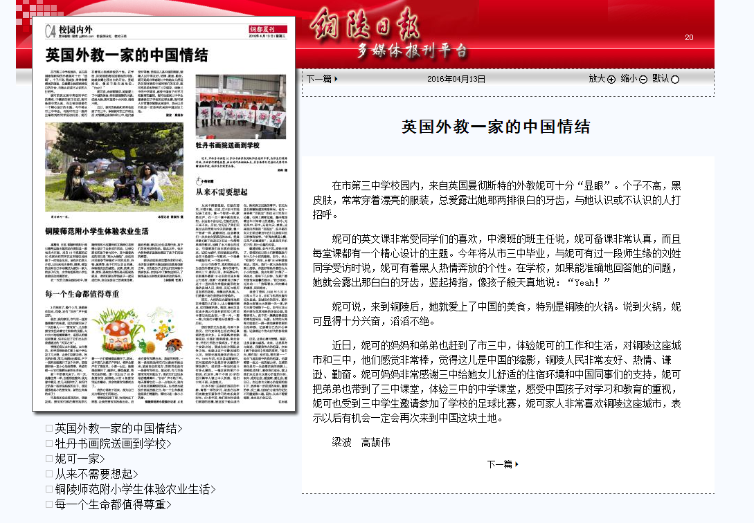 近日,妮可的妈妈和弟弟也赶到了市三中,体验妮可的工作和生活,对铜陵这座城市和三中,他们感觉非常棒,觉得这儿是中国的缩影,铜陵人民非常友好、热情、谦逊、勤奋。妮可妈妈非常感谢三中给她女儿舒适的住宿环境和中国同事们的支持,妮可把弟弟也带到了三中课堂,体验三中的中学课堂,感受中国孩子对学习和教育的重视,妮可也受到三中学生邀请参加了学校的足球比赛,妮可家人非常喜欢铜陵这座城市,表示以后有机会一定会再次来到中国这块土地。
