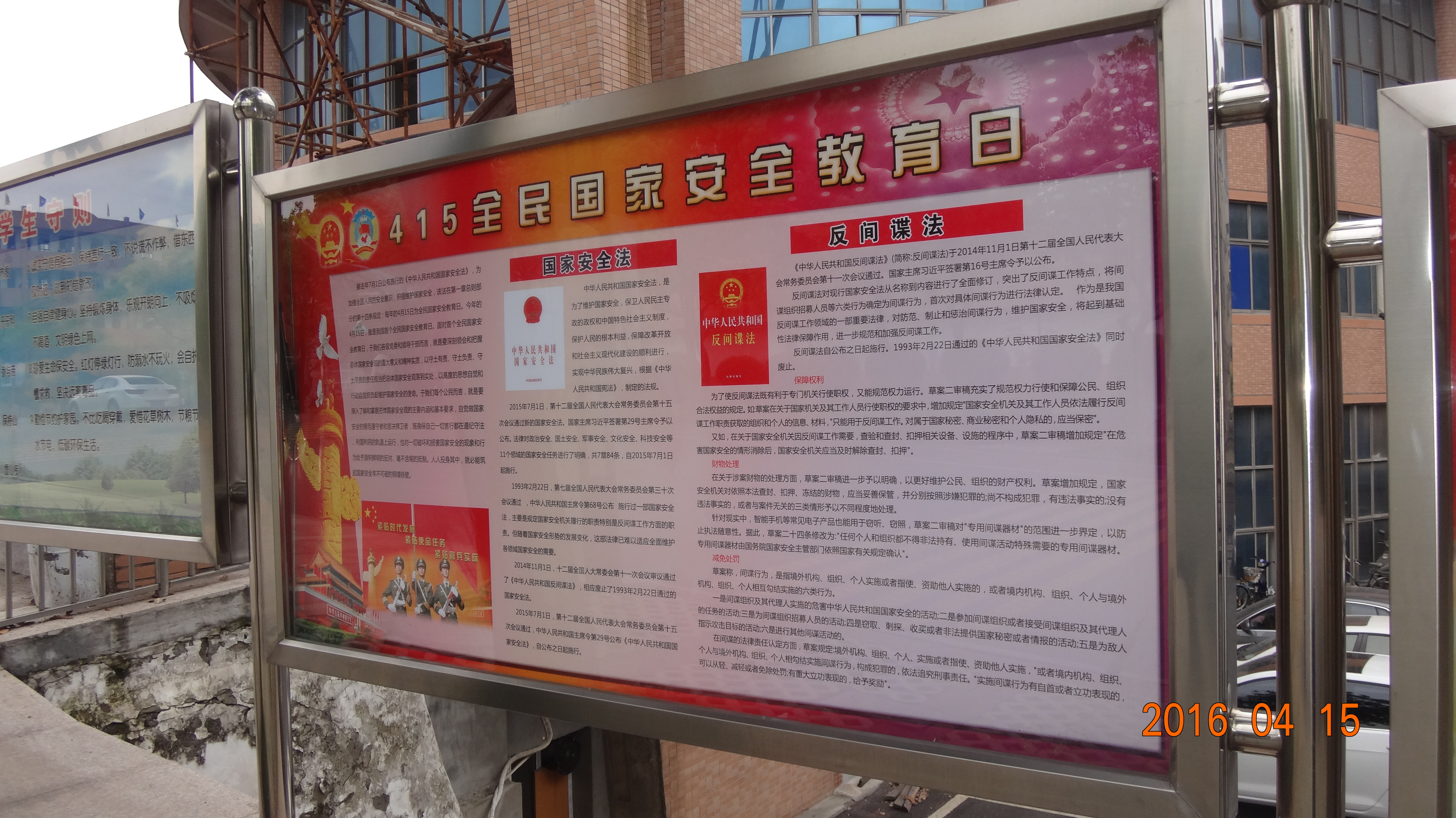 4月15日是“全民国家安全教育日”,为增强全民国家安全意识,履行维护国家安全的责任和义务,按照市教育局的要求,我校开展了电子屏打出宣传标语、宣传橱窗展出有关国家安全的知识、班级召开主题班会、班级教室里张贴宣传资料等多种形式的活动。